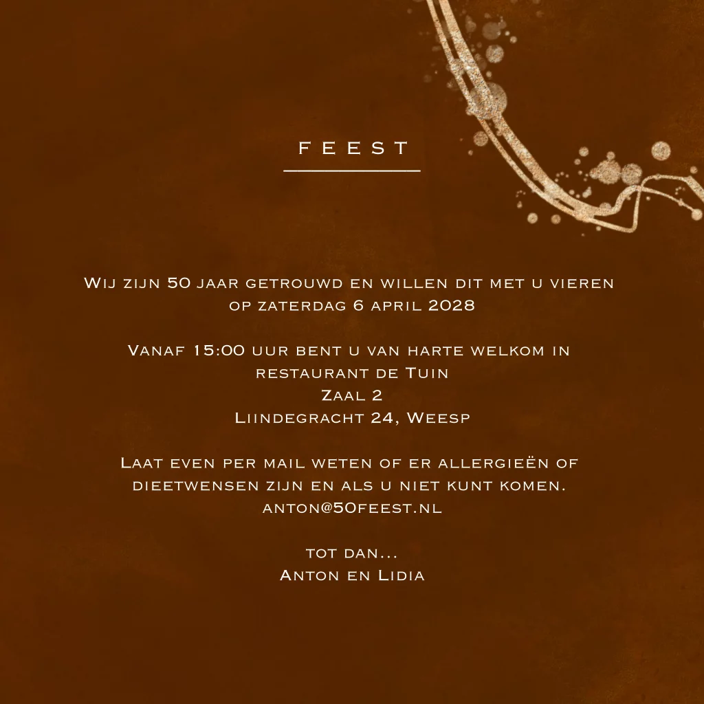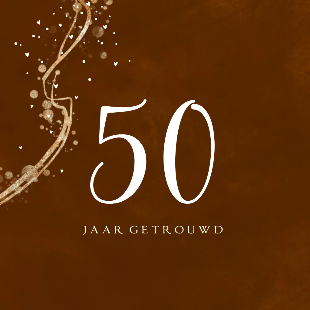 Huwelijksjubileum uitnodiging 50 jaar getrouwd met goudfolie druk versiering en cognac kleurige achtergrond. (23193)