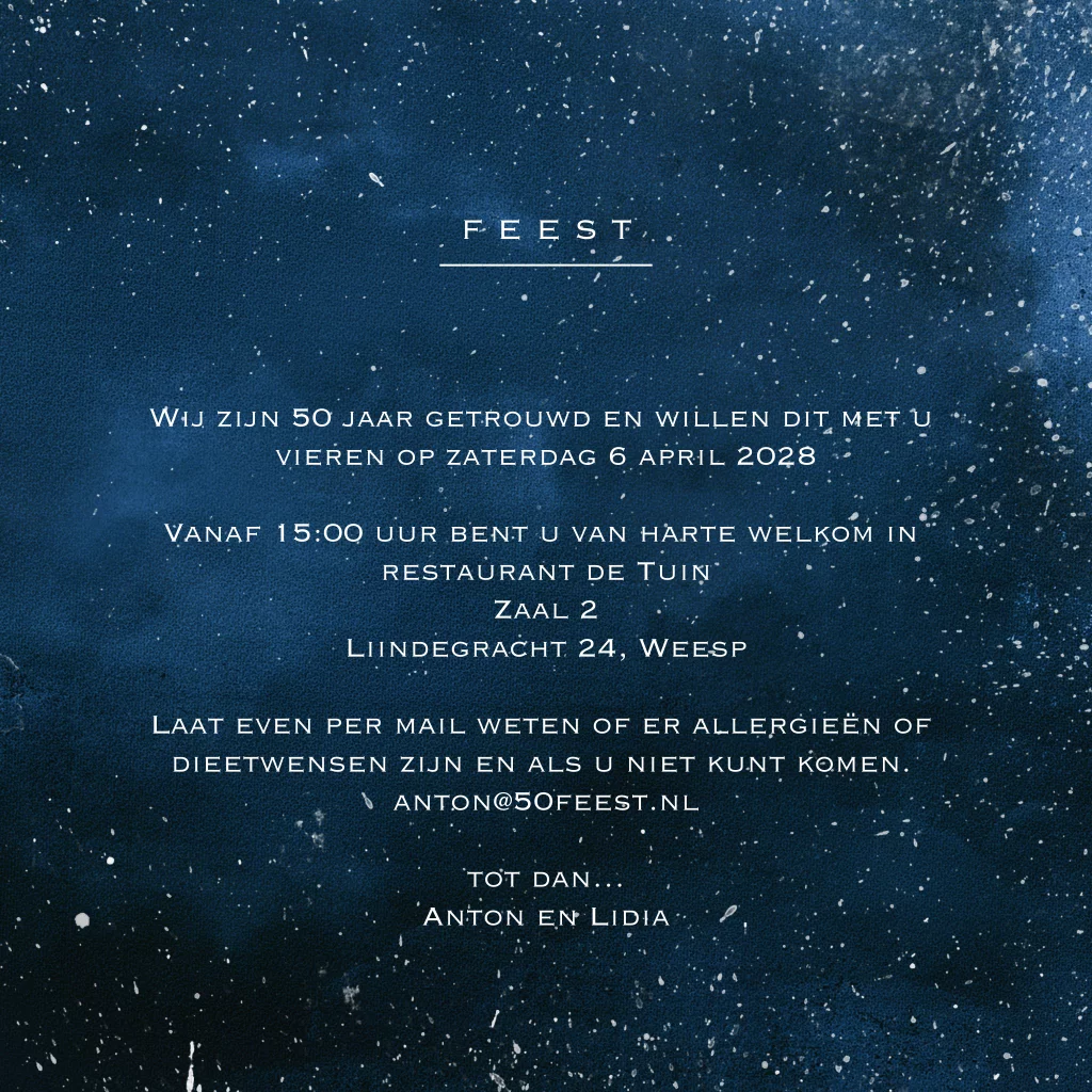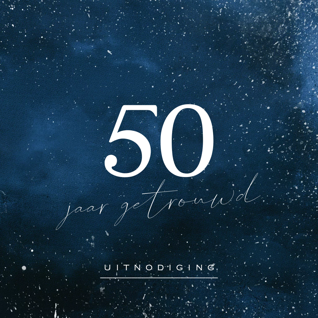 Uitnodiging 50 jaar getrouwd jubileumfeest met sterrenhemel blauw en goudfolie. (23190)