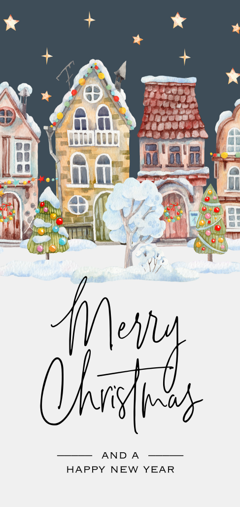 Kerstkaart winter blauw met huisjes