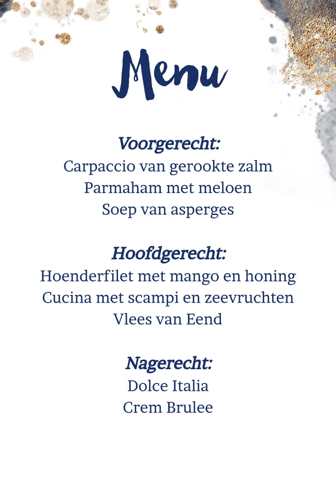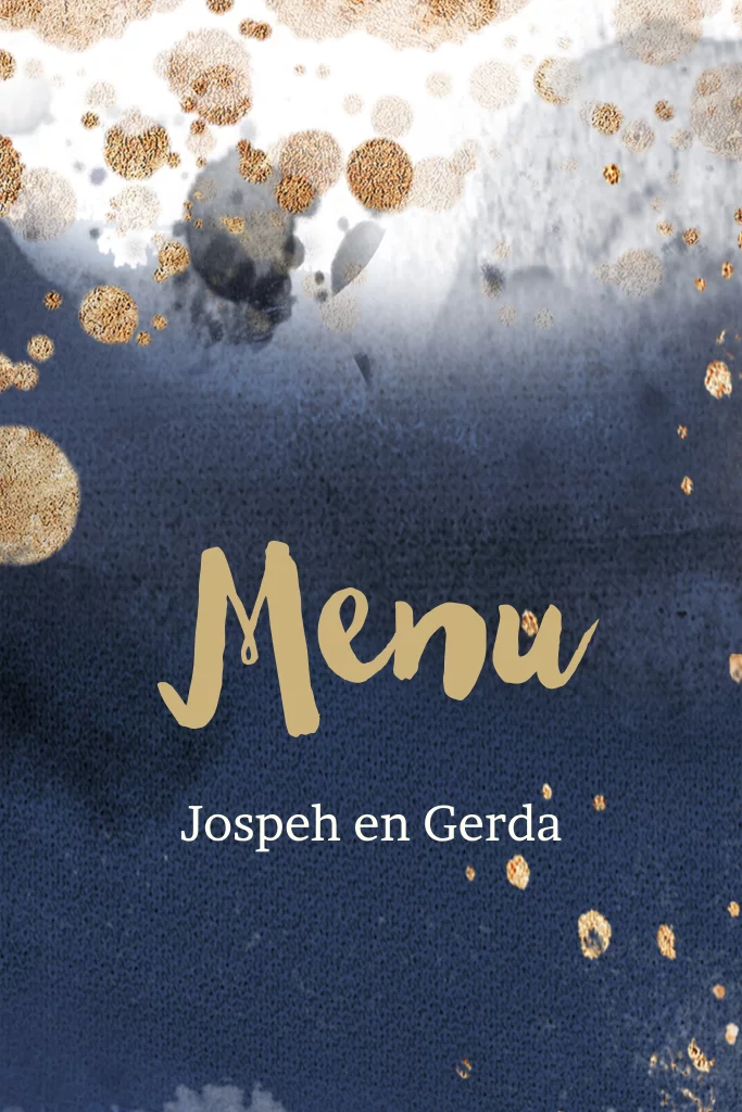 Menukaart voor een jubileum met blauw waterverf en goudkleurige versiering. (23191) De combinatie van blauw en goud zorgt voor een tijdloze en elegante uitstraling die de aandacht trekt. Of het nu gaat om een formeel diner of een informeel feest, deze menukaart voegt een vleugje verfijning toe aan elke gelegenheid.