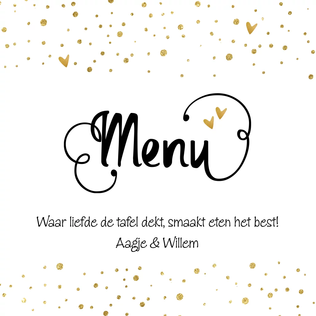 Stijlvolle menukaart voor jullie 50 jarig huwelijksjubileum. Met sierletters en vrolijke dots en hartjes in een goud-look. (geen goudfolie). Alles staat los en is te verplaatsen of om te kleuren. (24108)
