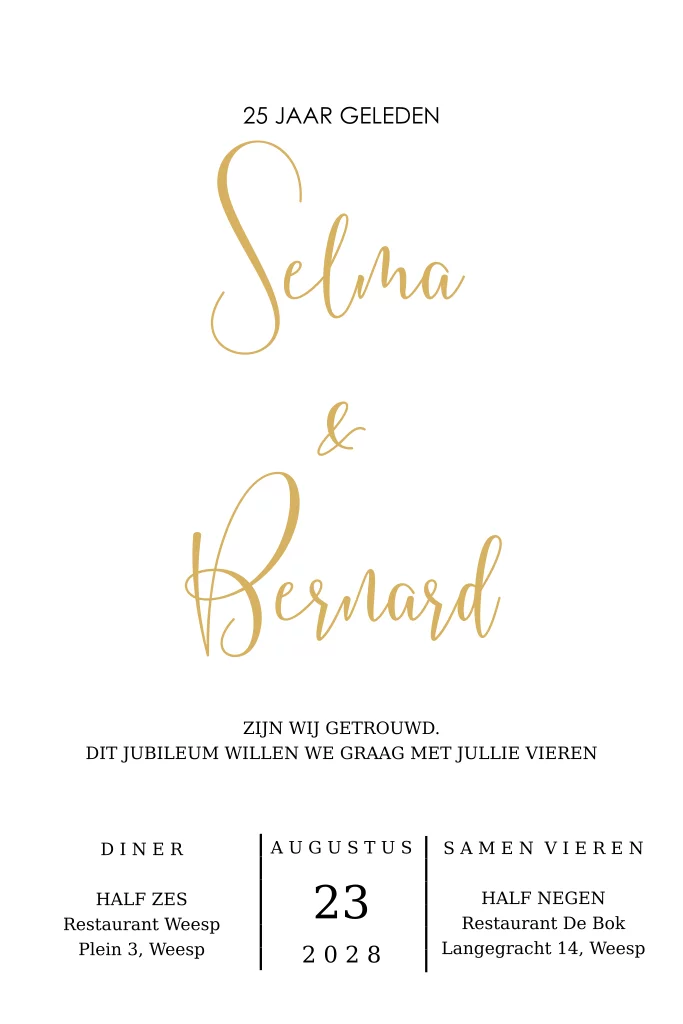 Minimalistisch en moderne jubileum uitnodiging 25 jaar geleden getrouwd.. Deze kaart heeft door de ronde hoeken een extra luxe uitstraling en tevens klassieke touch. (23405)