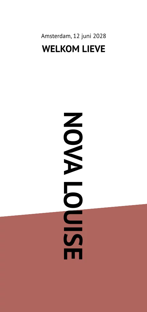 Modern geboortekaartje voor een meisje met schuine kleur vlakken een terra roza kleur, dit kan naar wens aan gepast worden. Extra hip langwerpig formaat 10x21cm) (23967). Het clean design en de speelse vlakken maken dit geboortekaartje een unieke keuze voor de aankondiging van jullie dochter. Kortom, dit geboortekaartje is een prachtige keuze voor ouders die op zoek zijn naar een eigentijds en stijlvol ontwerp voor de geboorteaankondiging van hun dochter.
