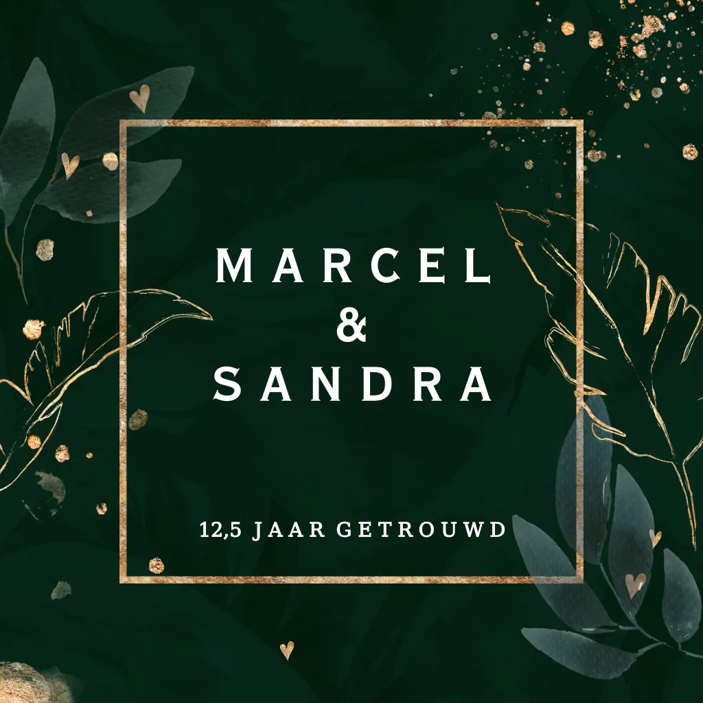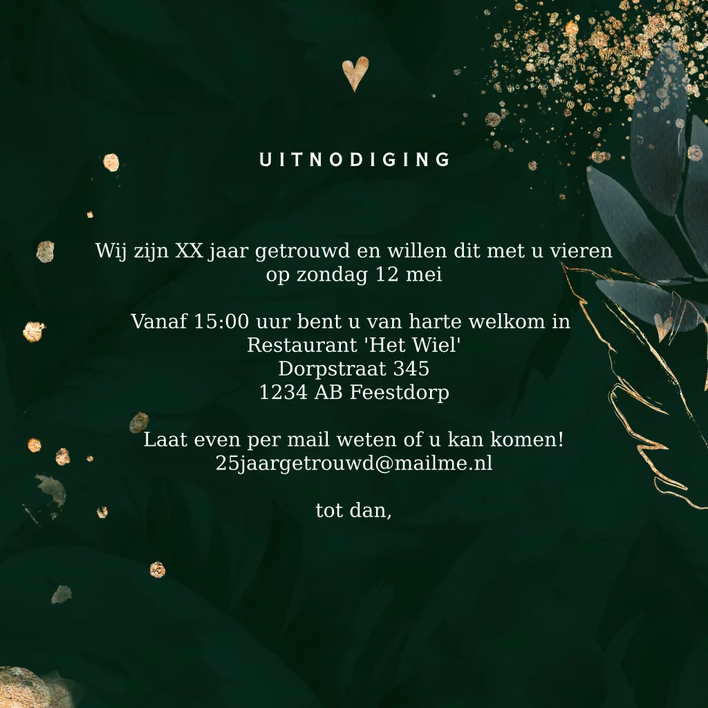 Jubileumkaart uitnodiging 12,5 jaar getrouwd. Donker groen met goud look spetters en bladeren. (23722)