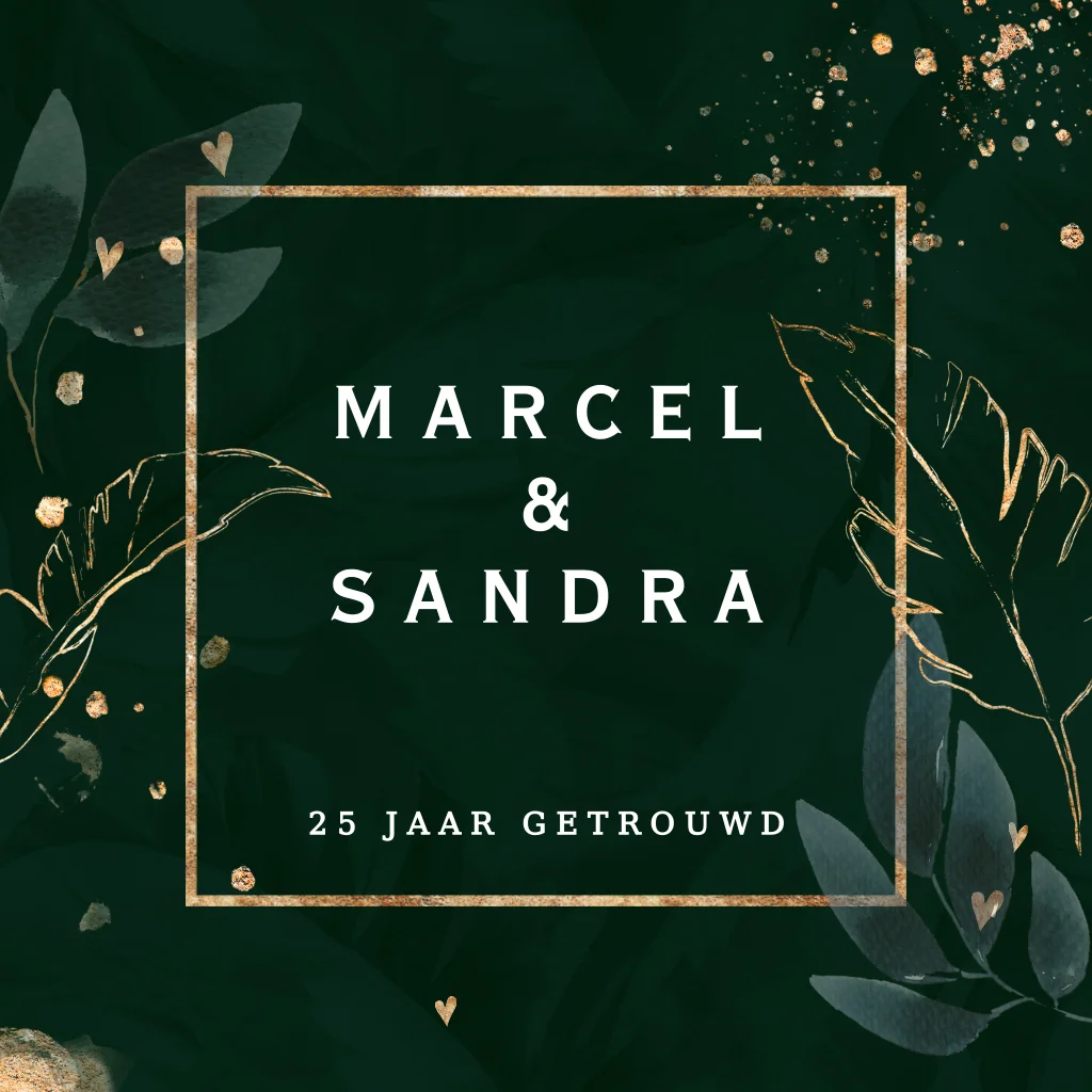 Moderne uitnodiging jubileum 25 jaar getrouwd. Donker groen met goud look spetters en bladeren. (23722)