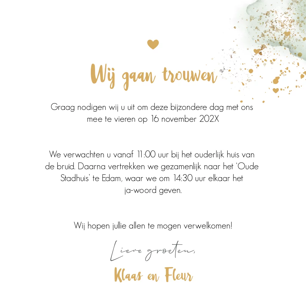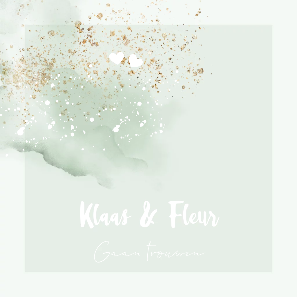 Hippe trouwkaart met pastel groene achtergrond, hartjes, waterverf en gouden foliedruk. (23711)