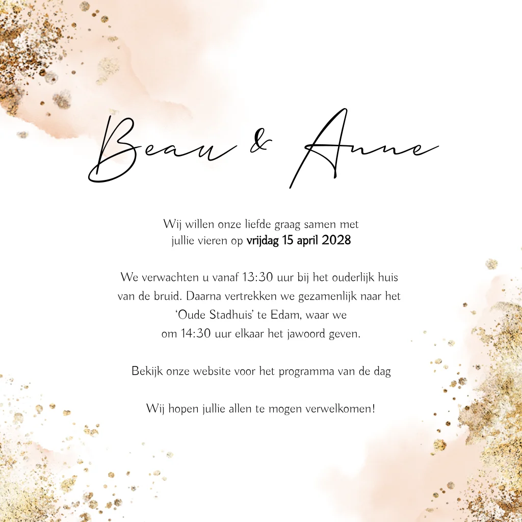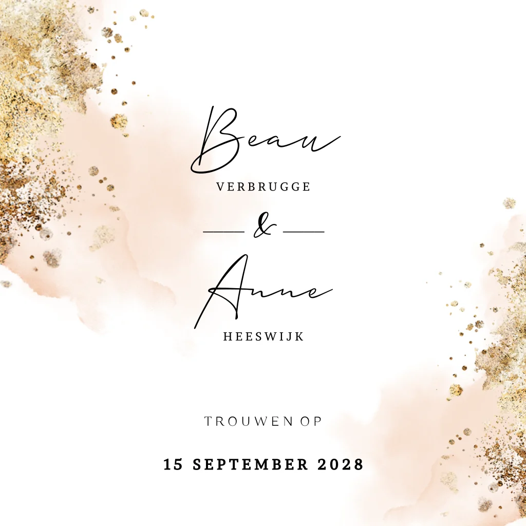 Mooie moderne trouwkaart met roze aquarel waterverf vlekken en goudlook spetters. (24267). Deze kaart heeft nu ronde hoeken (€ 0,30 per kaart) maar kan ook met standaard rechte hoeken.