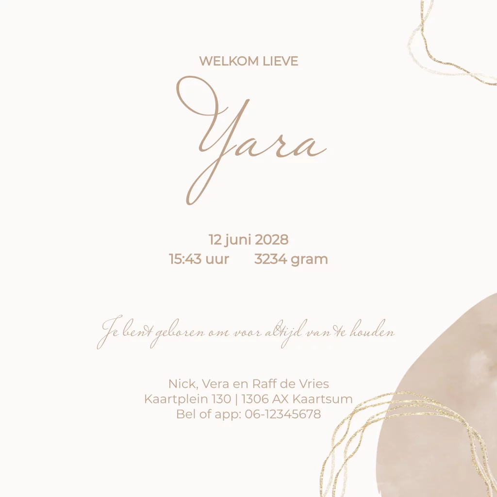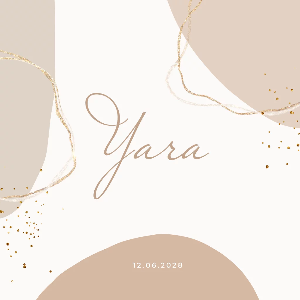 De combinatie van aquarel, beige, bruin en geometrische elementen geeft dit kaartje een moderne en stijlvolle uitstraling. De pastelkleuren zorgen voor een zachte en lieflijke touch, perfect passend bij de geboorte van jullie dochtertje. (23980) Geboortekaartje Yara