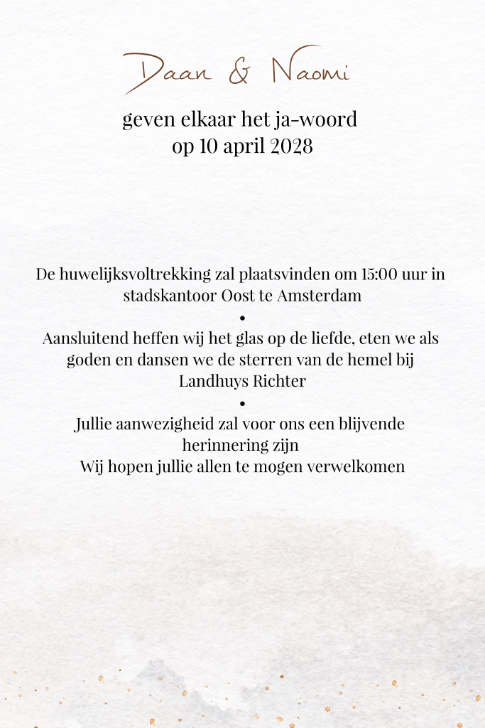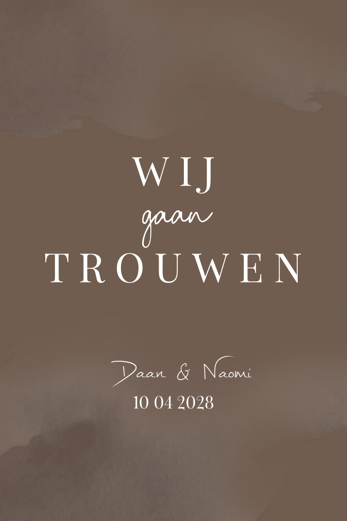 Mooie Trouwkaart in bruine kleur zandkleur met een minimalistisch design. (23689) Het ontwerp is eenvoudig en chic, met een rustieke en natuurlijke uitstraling. De kaart is perfect voor een bruiloft in de buitenlucht of een huwelijksjubileum.