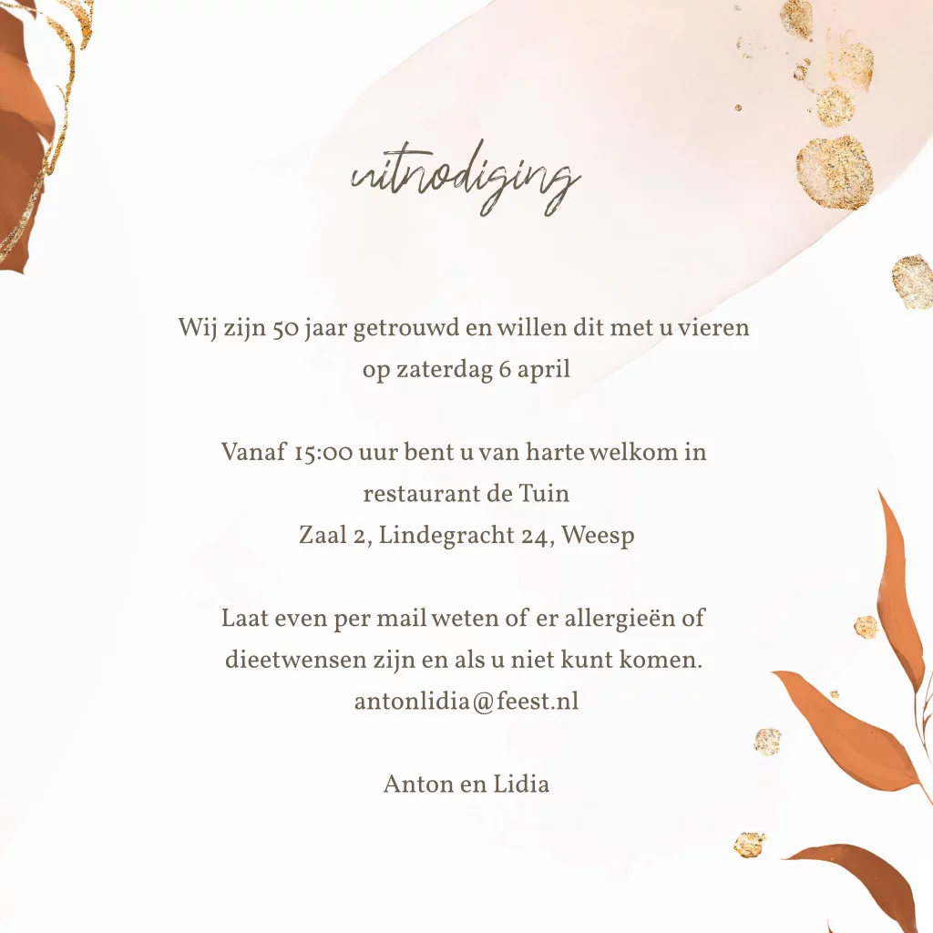 Uitnodiging 50 jaar getrouwd jubileumfeest kleurrijk oranje met bladeren. (23290)