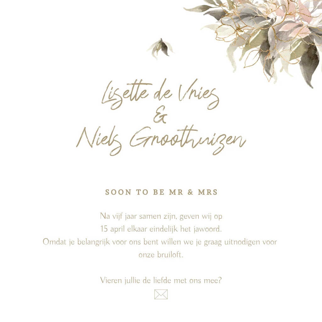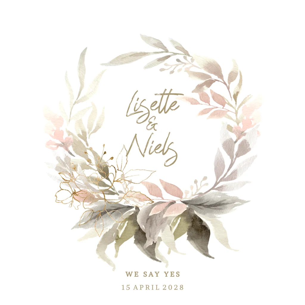 Prachtige trouwkaart met waterverf getekende bloemen en bladeren. Aan de binnenkant ruimte voor de planning van de trouwdag met symbolen en icoontjes. (23908)