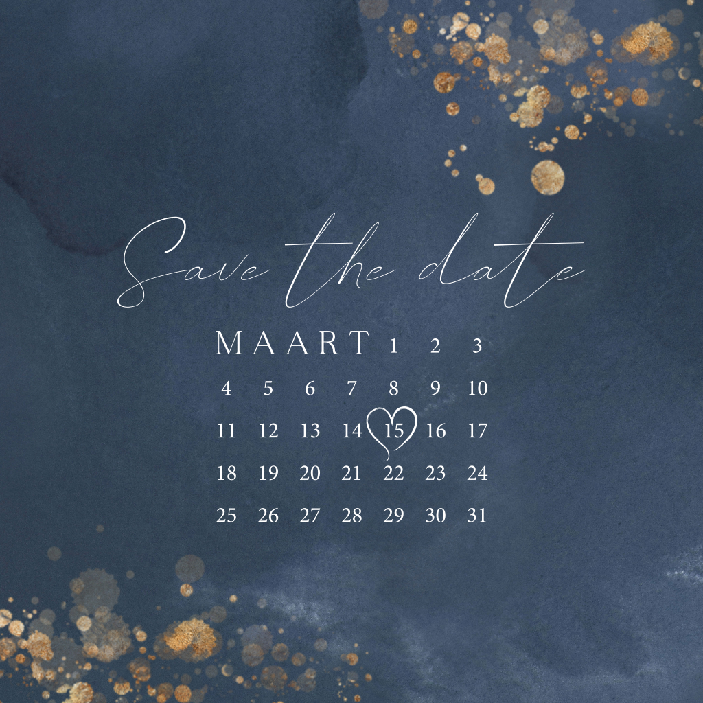 Moderne blauwe save the date met goudfolie