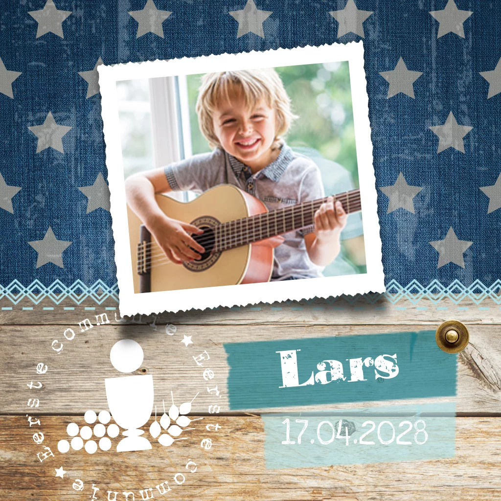 Stoere uitnodiging eerste communie feestje met jeans achtergrond, eigen foto en een stempel. (23564)