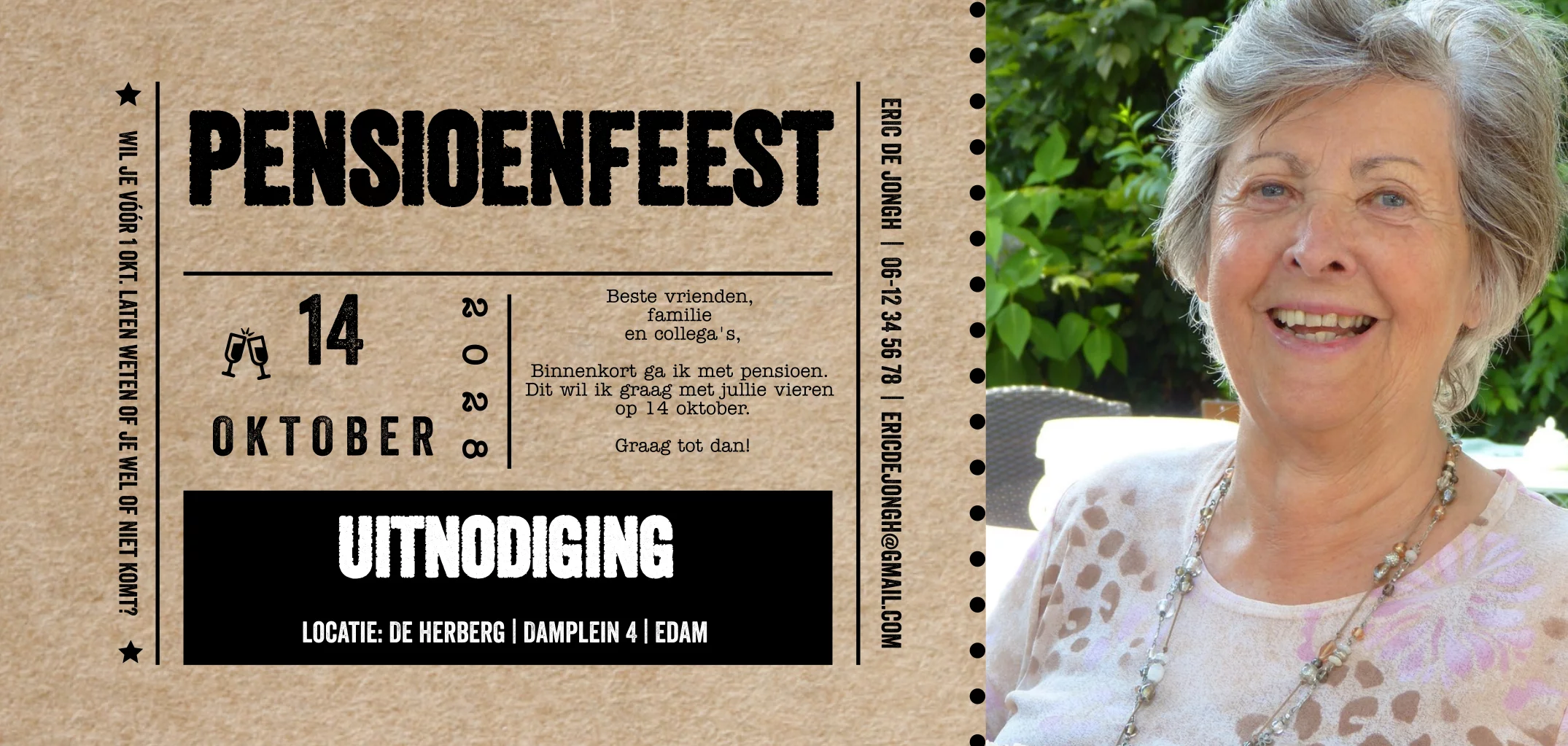 Ticket pensioen vrouw uitnodiging met eigen foto