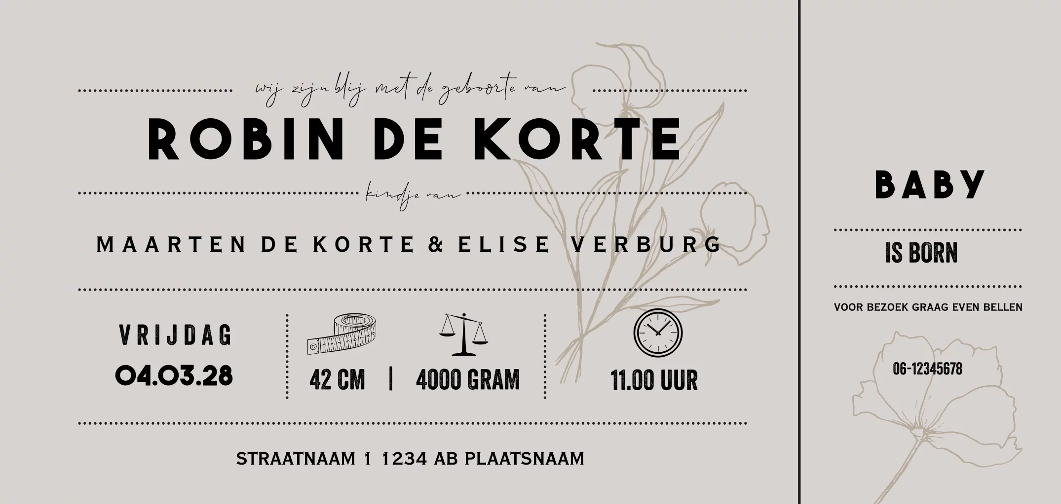 Hippe ticket geboortekaartje voor een jongen of meisje. In een neutrale kleur. (23030)
