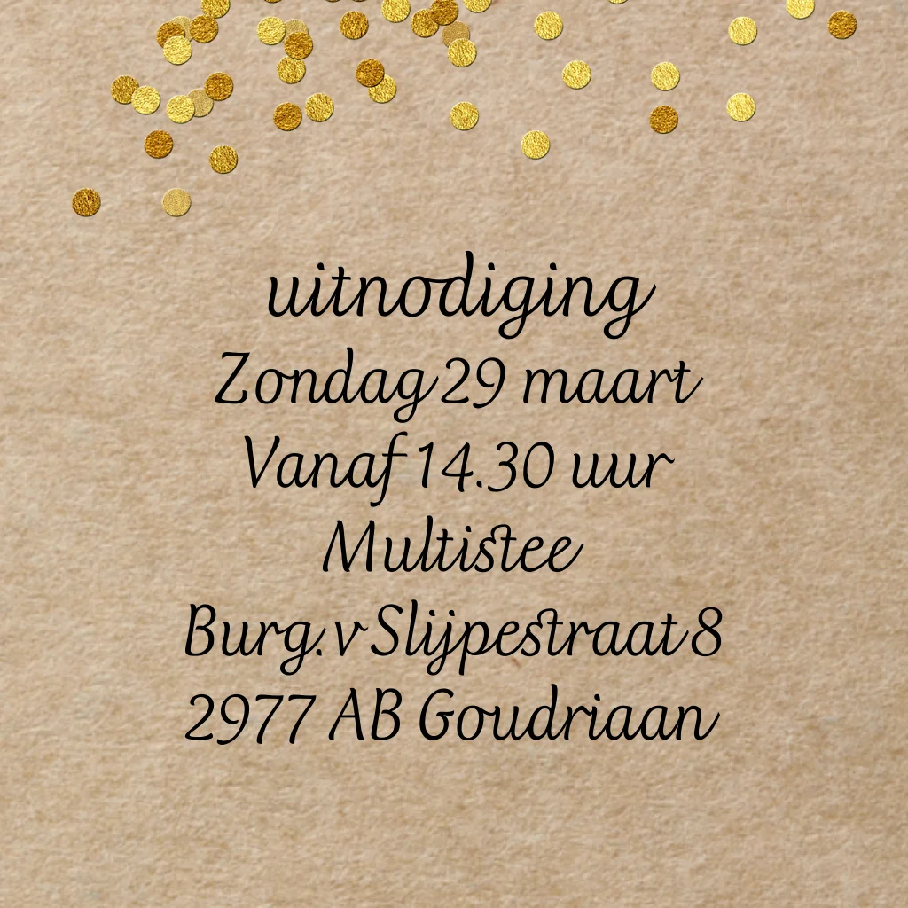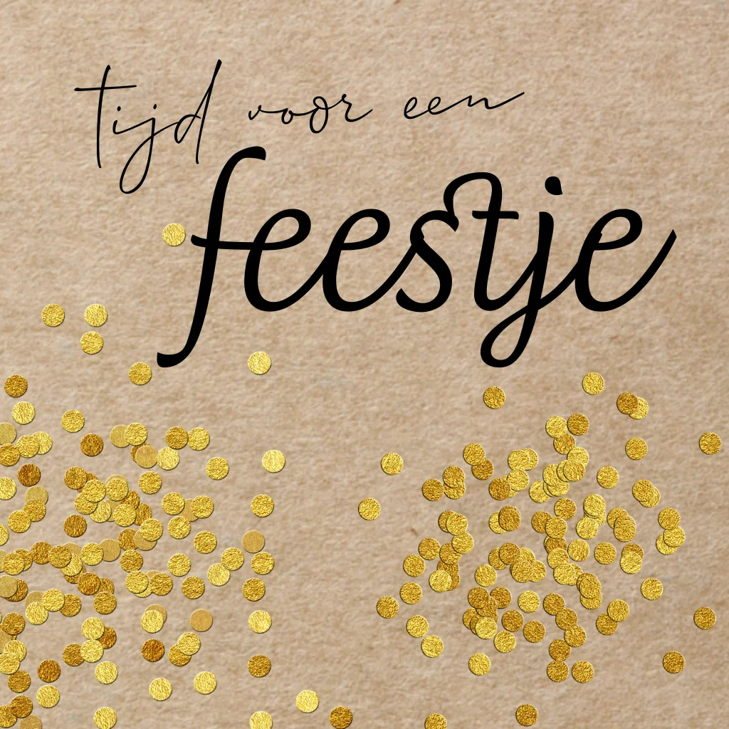 Tijd voor een feestje uitnodiging met kraft look karton als achtergrond en goud-look gedrukte confetti snippers. (23920) Tip: Je kunt altijd zelf wat confetti in de envelop toevoegen voor een extra feestelijk momentje voor de ontvanger van je uitnodiging.