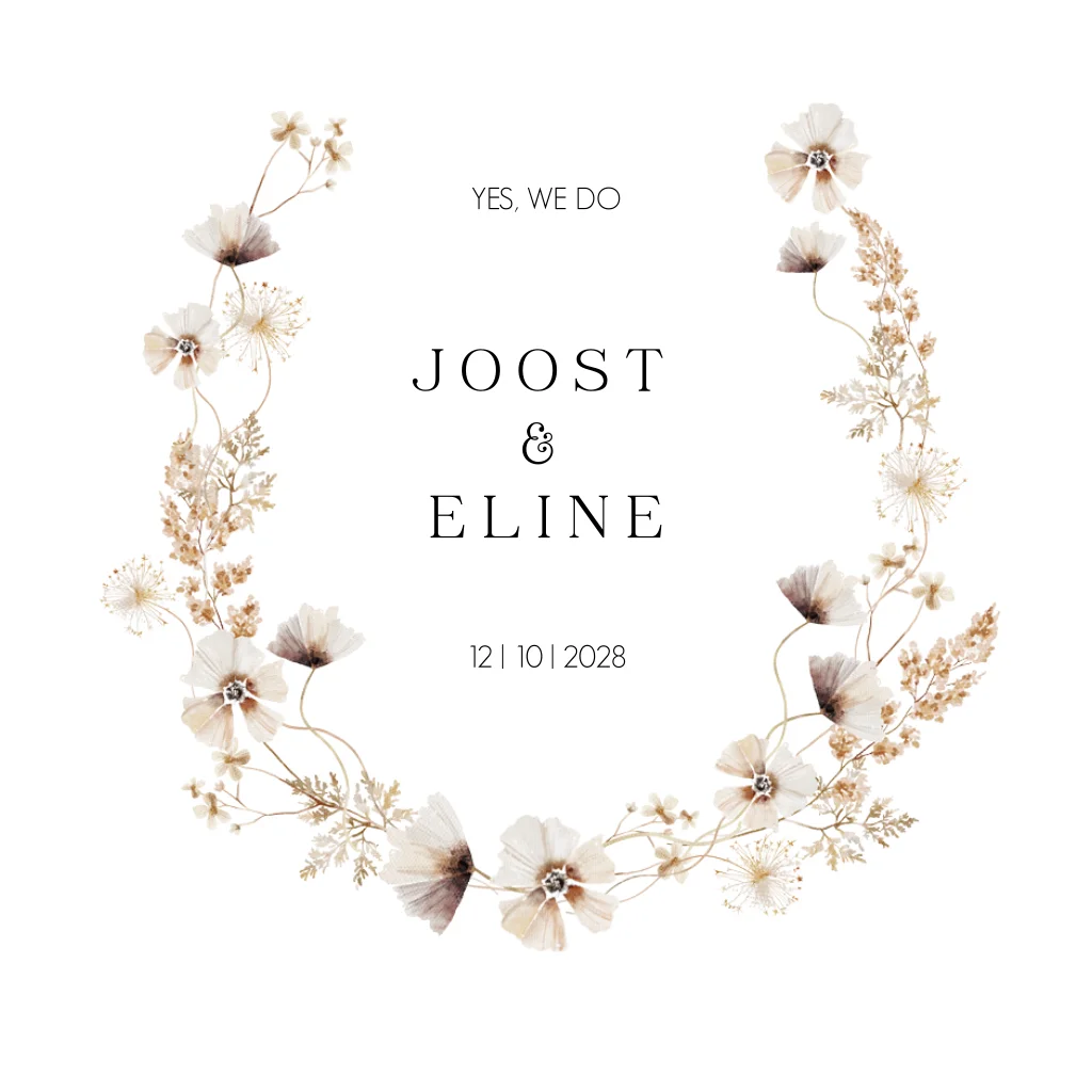 Trouwkaart met getekende bloemen in nude en aarde natuurlijke tinten. (23357) De kleur van je trouwkaarten is naar wens aan te passen.