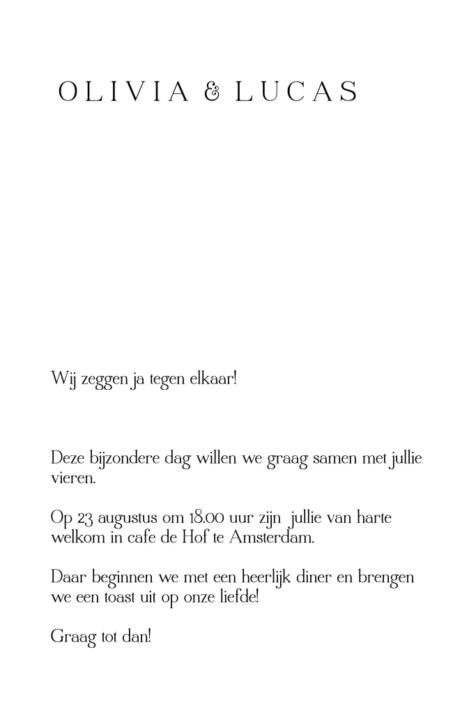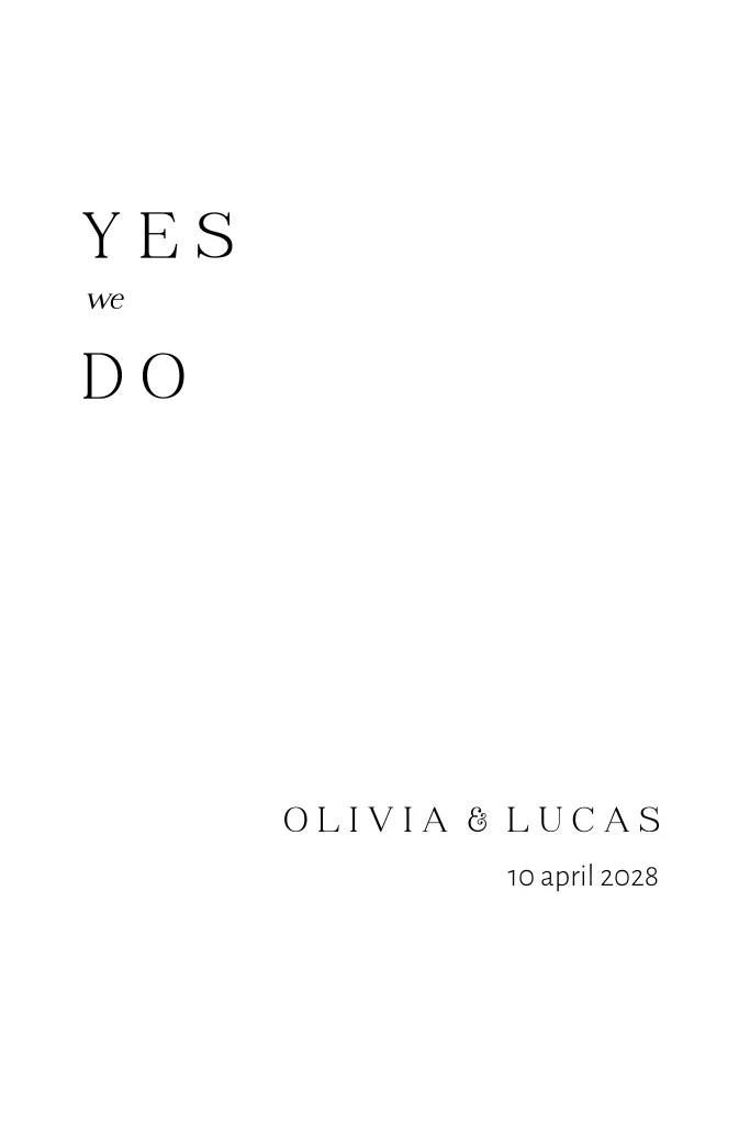 Mooi minimalistisch design met luxe letters. (23546). De rustige en eenvoudige sfeer is stijlvol en chic. Deze zwart-wit trouwkaart is perfect voor bruilofts en andere speciale gelegenheden. Dit ontwerp is perfect voor koppels die een rustige en eenvoudige bruiloft willen. De klassieke zwart-wit kleuren zorgen ervoor dat deze trouwkaart elegant en stijlvol is. De luxe letters geven de kaart een chique uitstraling. Deze kaart is geschikt voor elk seizoen en is perfect voor bruilofts en andere speciale gelegenheden.