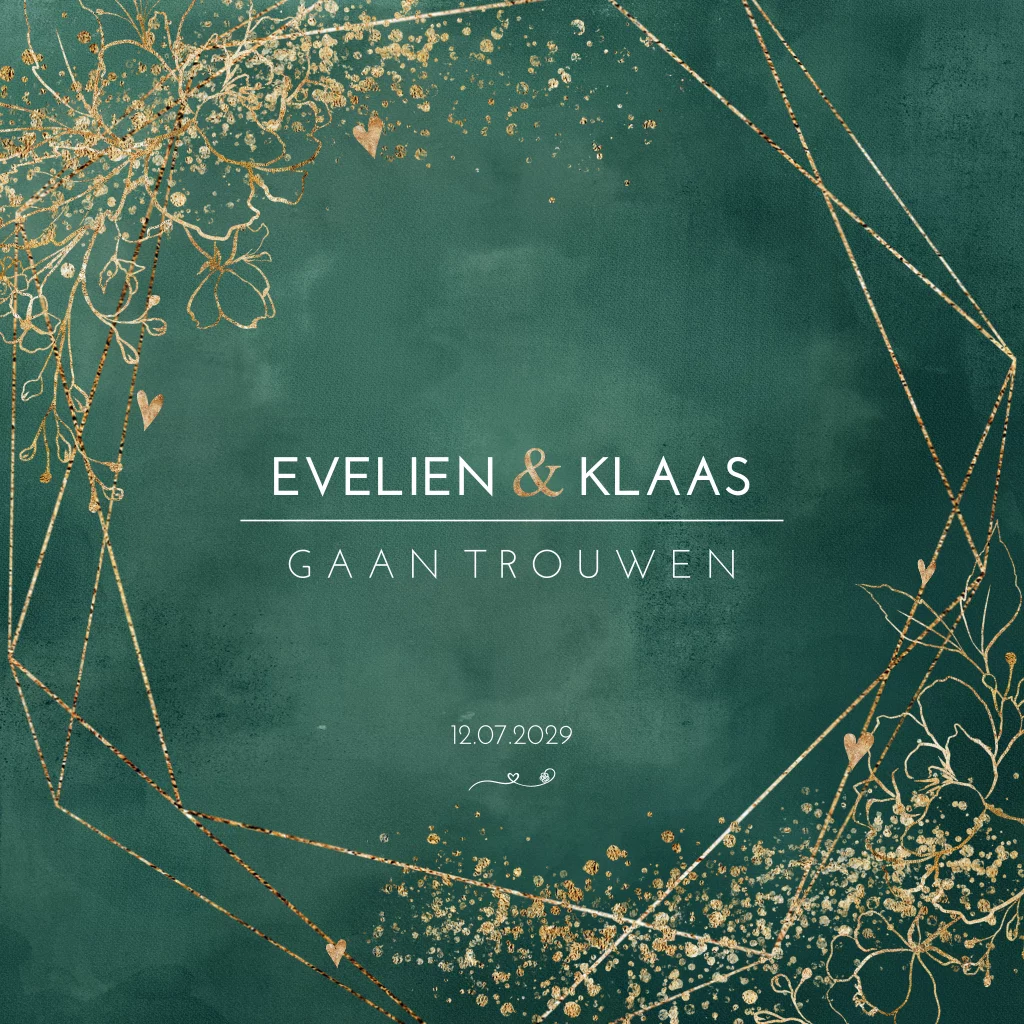 Trouwkaart met goud kleurige bloemen, en hartjes op een donker groene achtergrond. (24286)