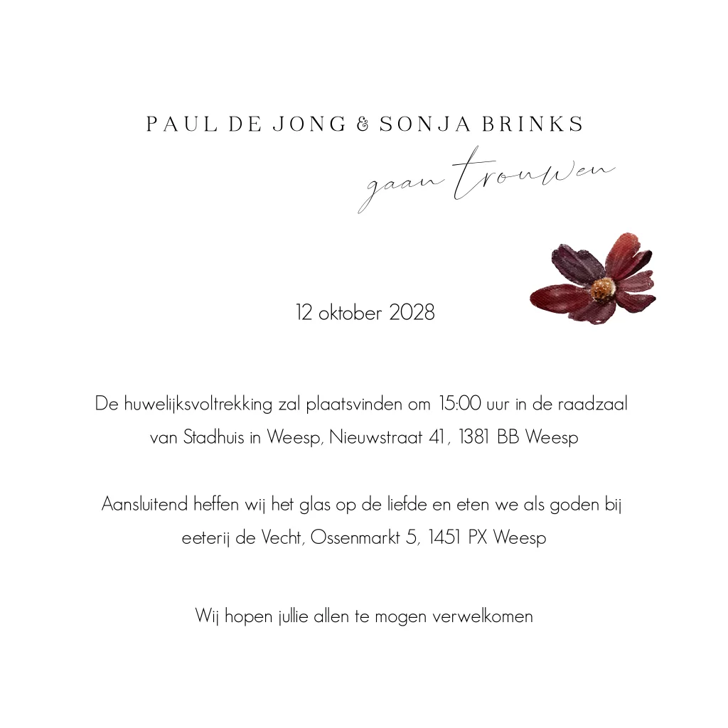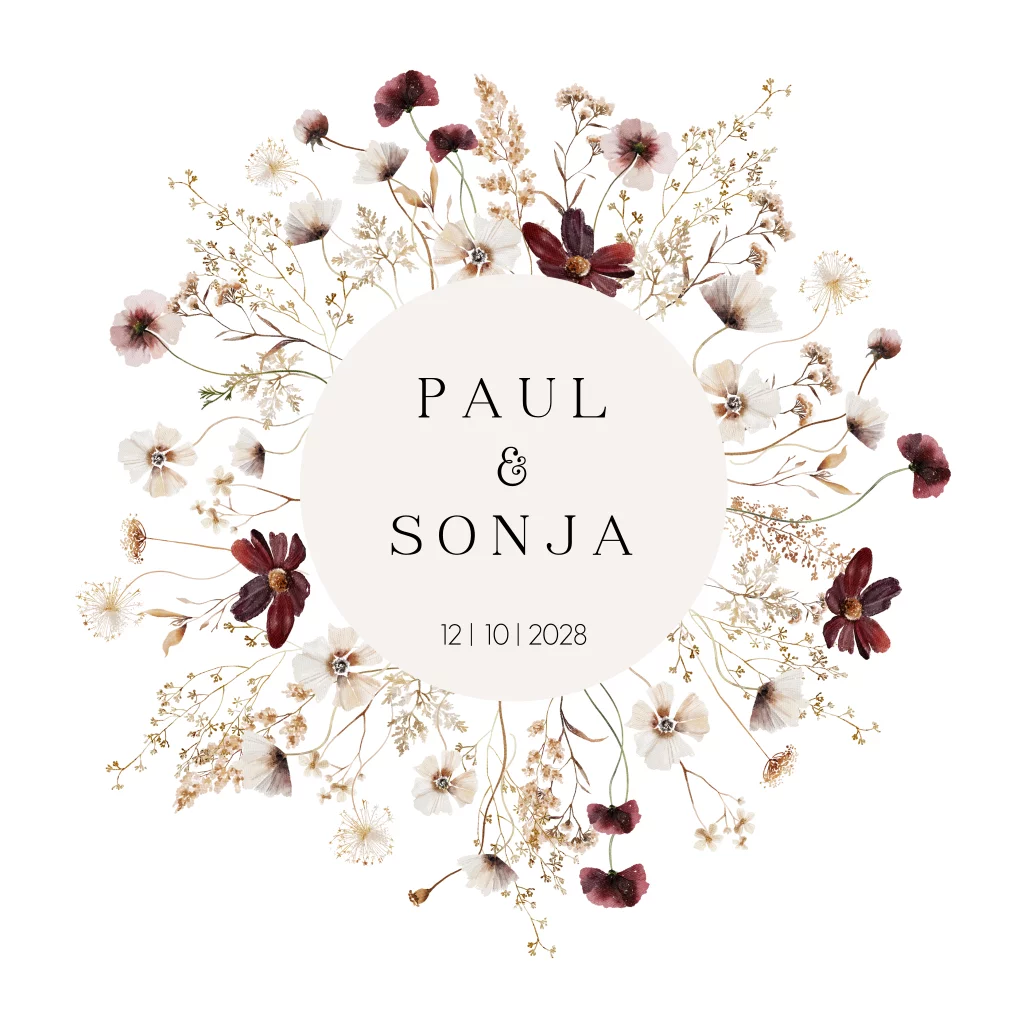 Botanische trouwkaart met waterverf bloemenkrans getekende droogbloemen en takjes. (23354)