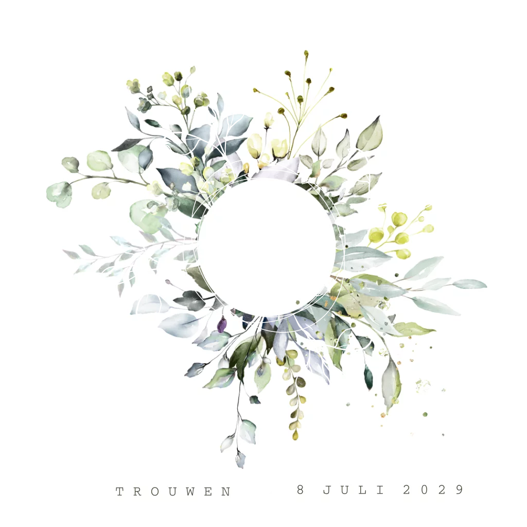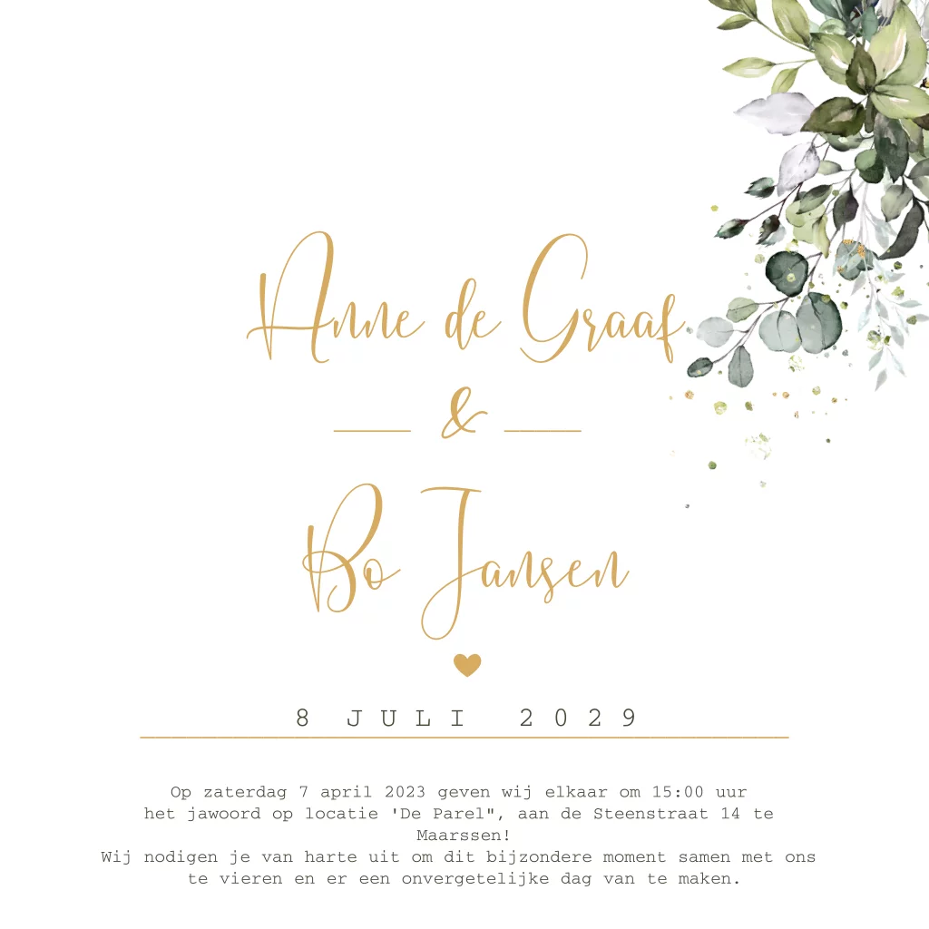 Trouwkaart met eucalyptus bladeren en foliedruk