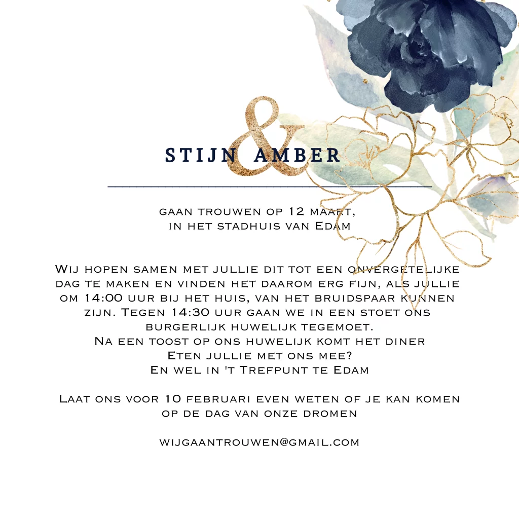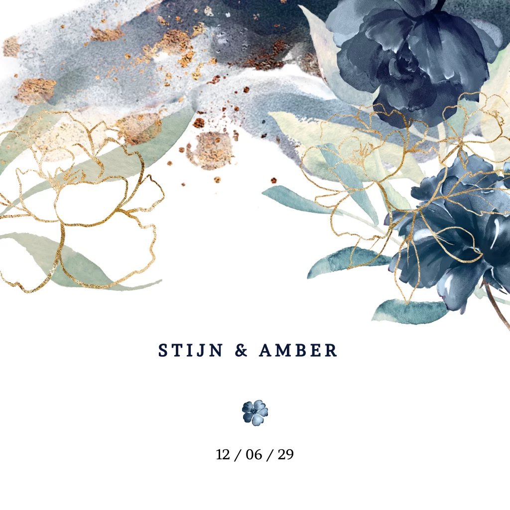 Een prachtige trouwkaart met blauwe aquarel bloemen en goudkleurige elementen. (24276)