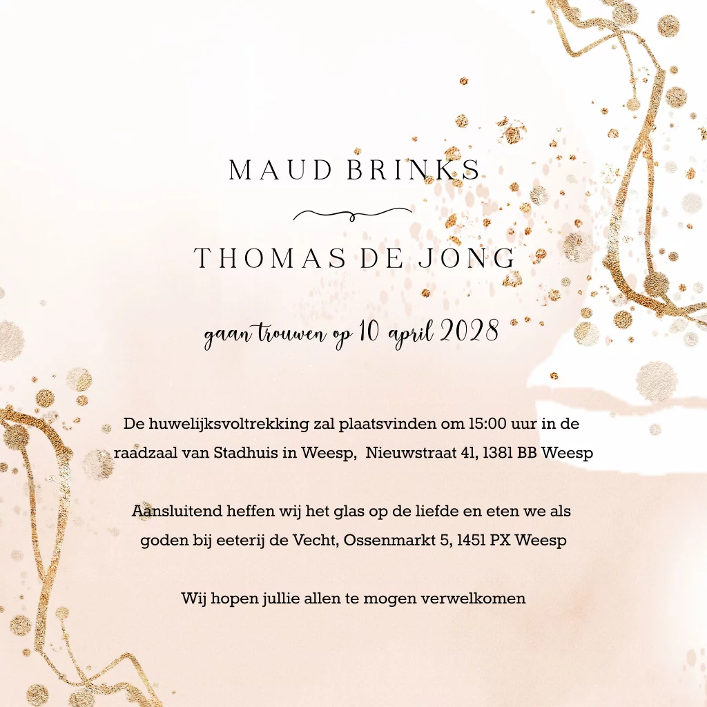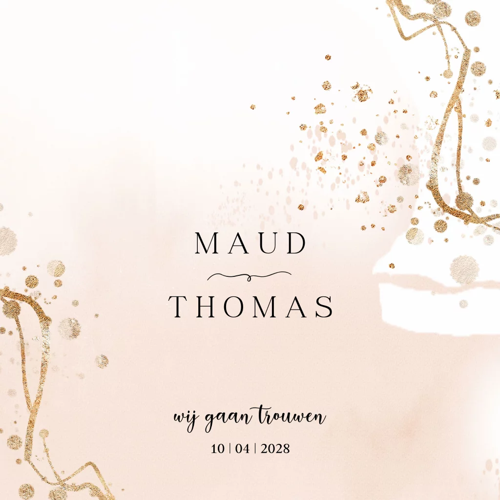 Moderne trouwkaart roze waterverf en goudlook versiering. (23321)
