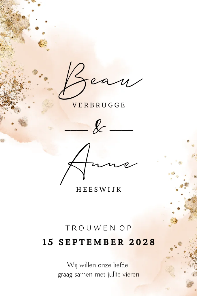 Hippe trouwkaart met roze aquarel waterverf vlekken en goudlook spetters. (24267) Wil je deze kaart maar dan dubbel zodat je meer ruimte hebt? Dat kan! Neem daarvoor contact met ons op.