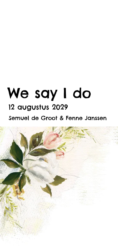 Een staande trouwkaart met een olieverf getekende bloemen boeket en wit vlak met ruimte voor de aankondigingsteksten (24266)