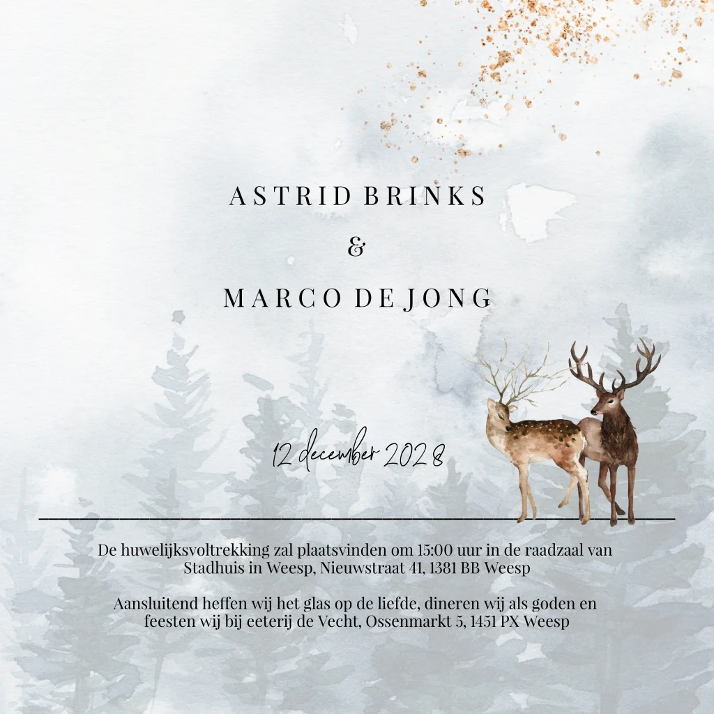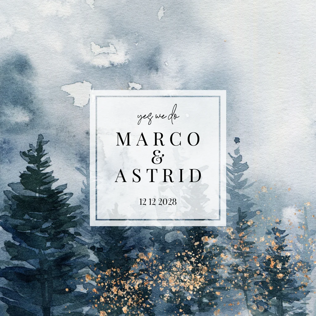 Prachtige trouwkaart met goudlook accenten voor enkele bomen met een lucht donker blauw waterverf achtergrond. (23649)