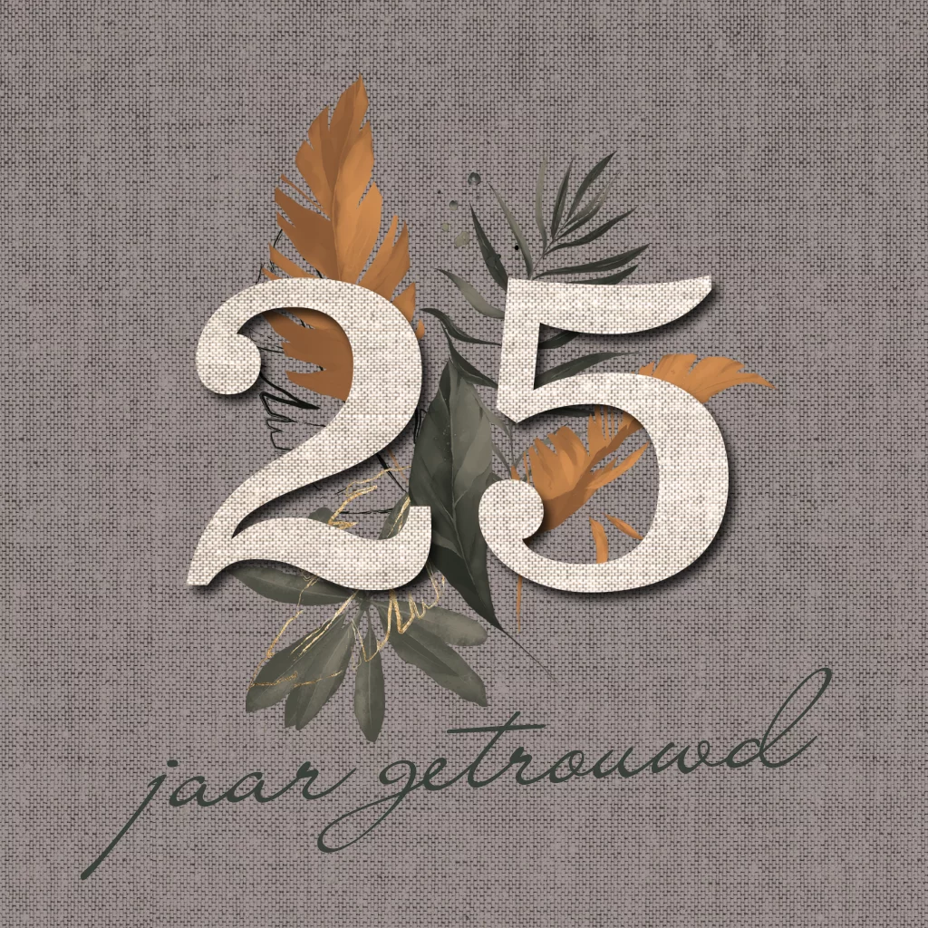 Uitnodiging jubileumfeest kaart 25 jaar getrouwd met grijs linnen look achtergrond en bladeren. (23281) Wil je een ander jaartal in dezelfde stijl, neem dan contact met ons op, je kunt dit helaas niet zelf aanpassen of je moet een 'gewone' tekst plaatsen. (Deze kaart heeft nu ronde hoeken a € 0,30 extra per kaart, in je kunt dit ook met rechte hoeken bestellen)