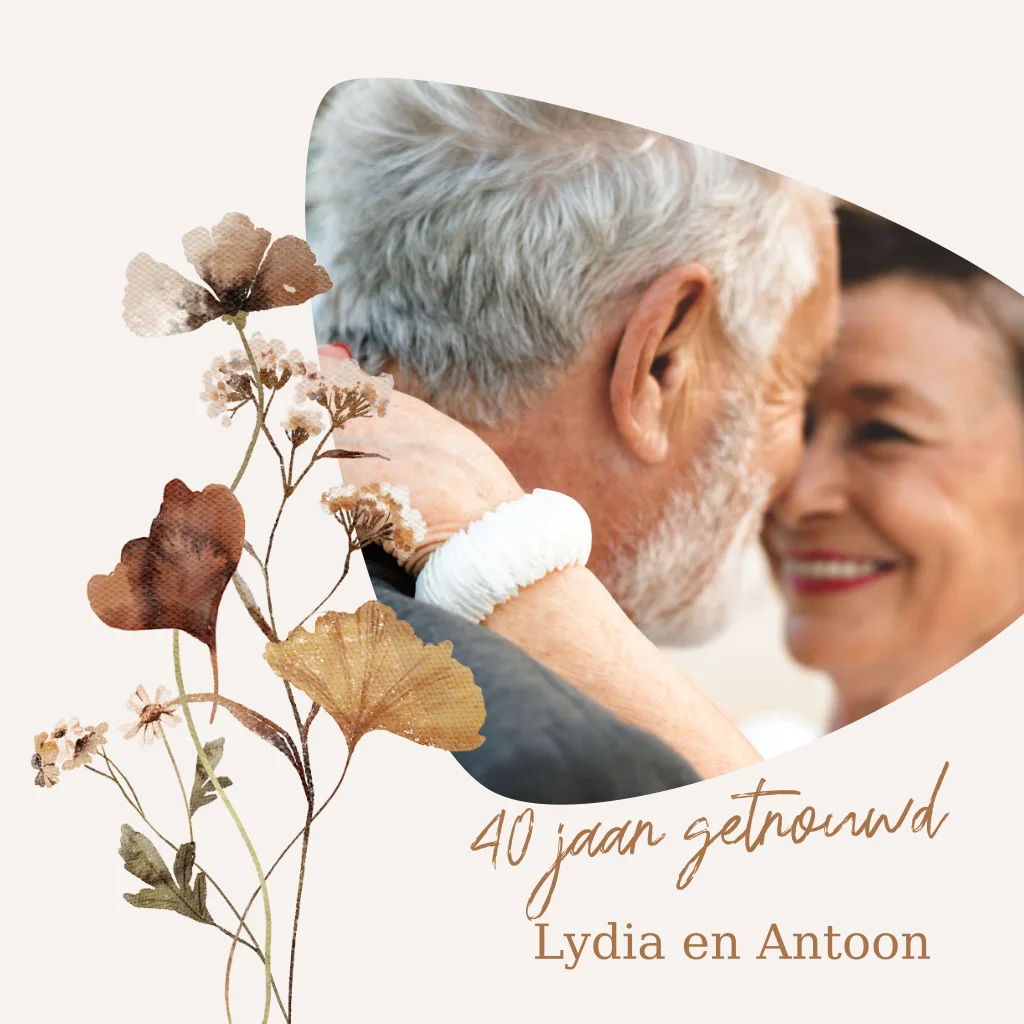 Prachtige uitnodiging 40 jaar getrouwd met foto achter een kader en met bloemen. (23464)