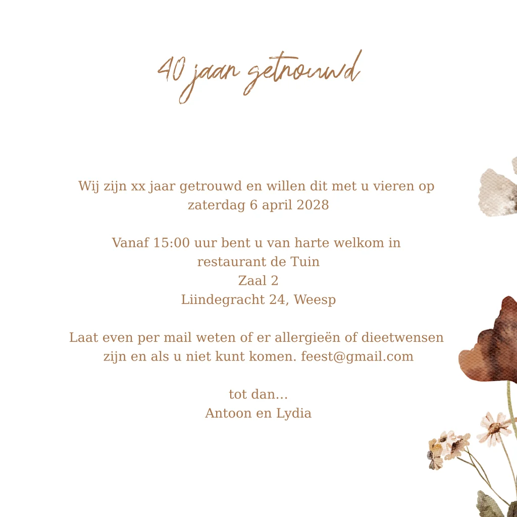Uitnodiging 40 jarig jubileumfeest met bloemen en foto