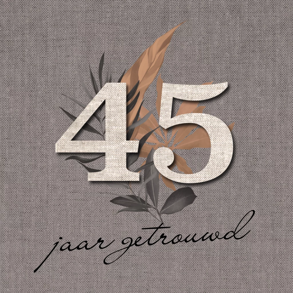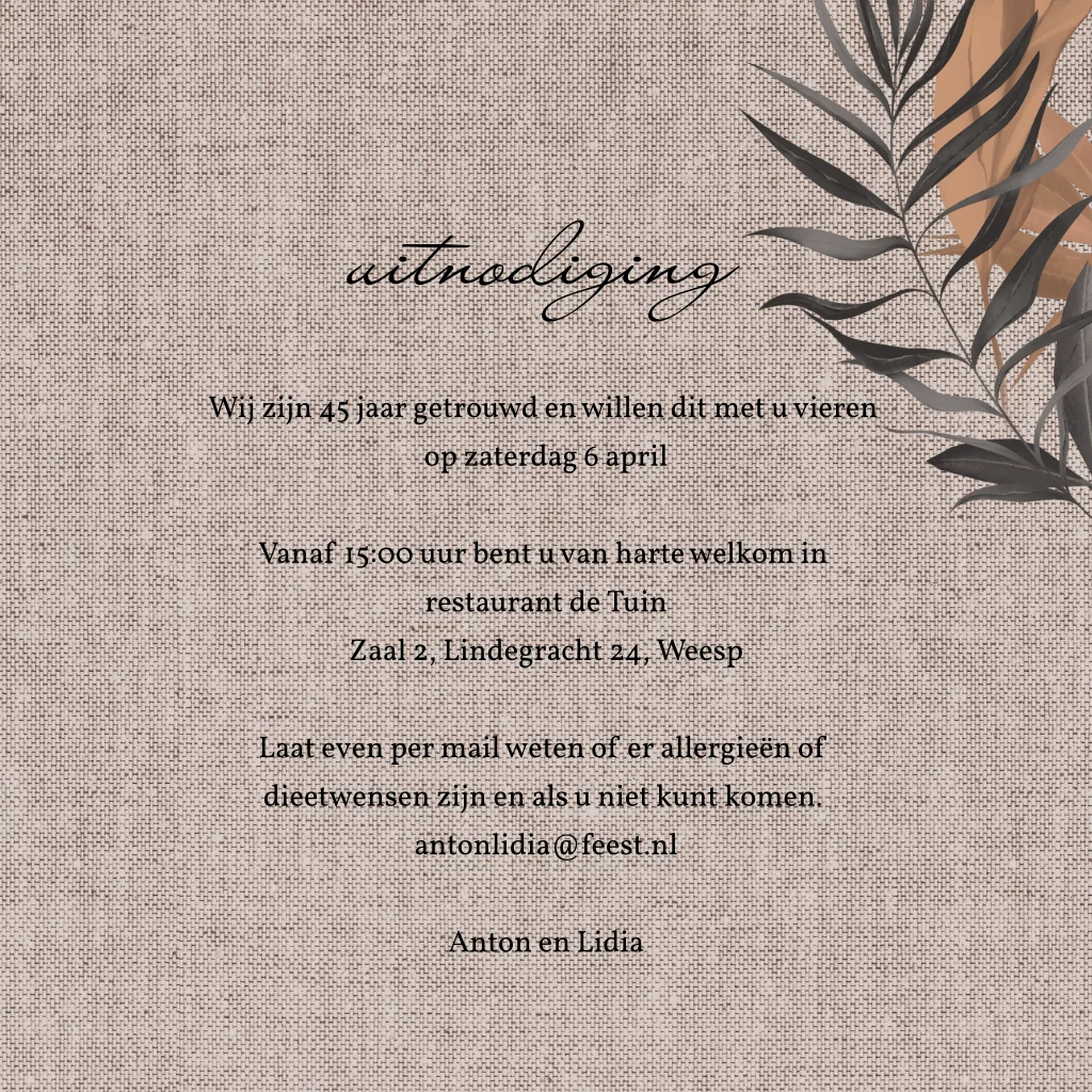 Uitnodiging jubileumfeest 45 jaar getrouwd met grijs linnen look achtergrond en bladeren. (23281)