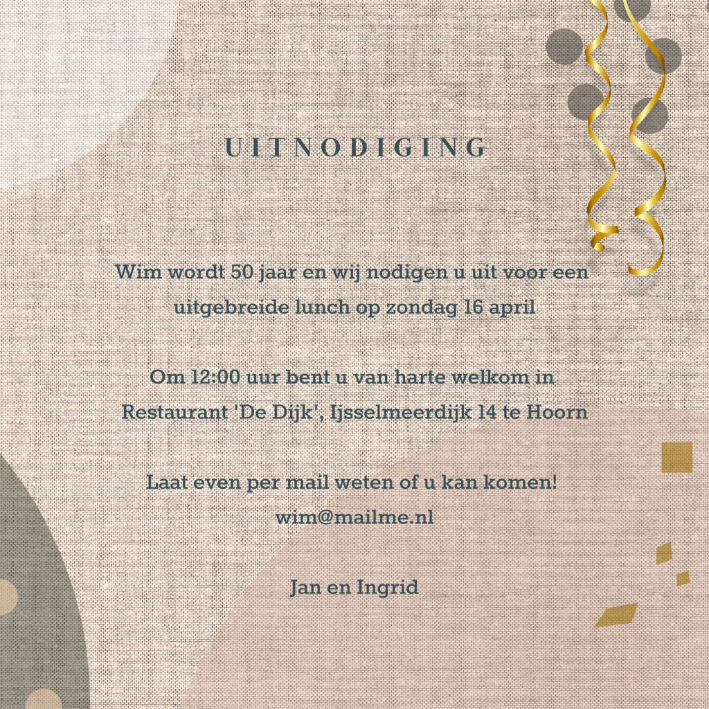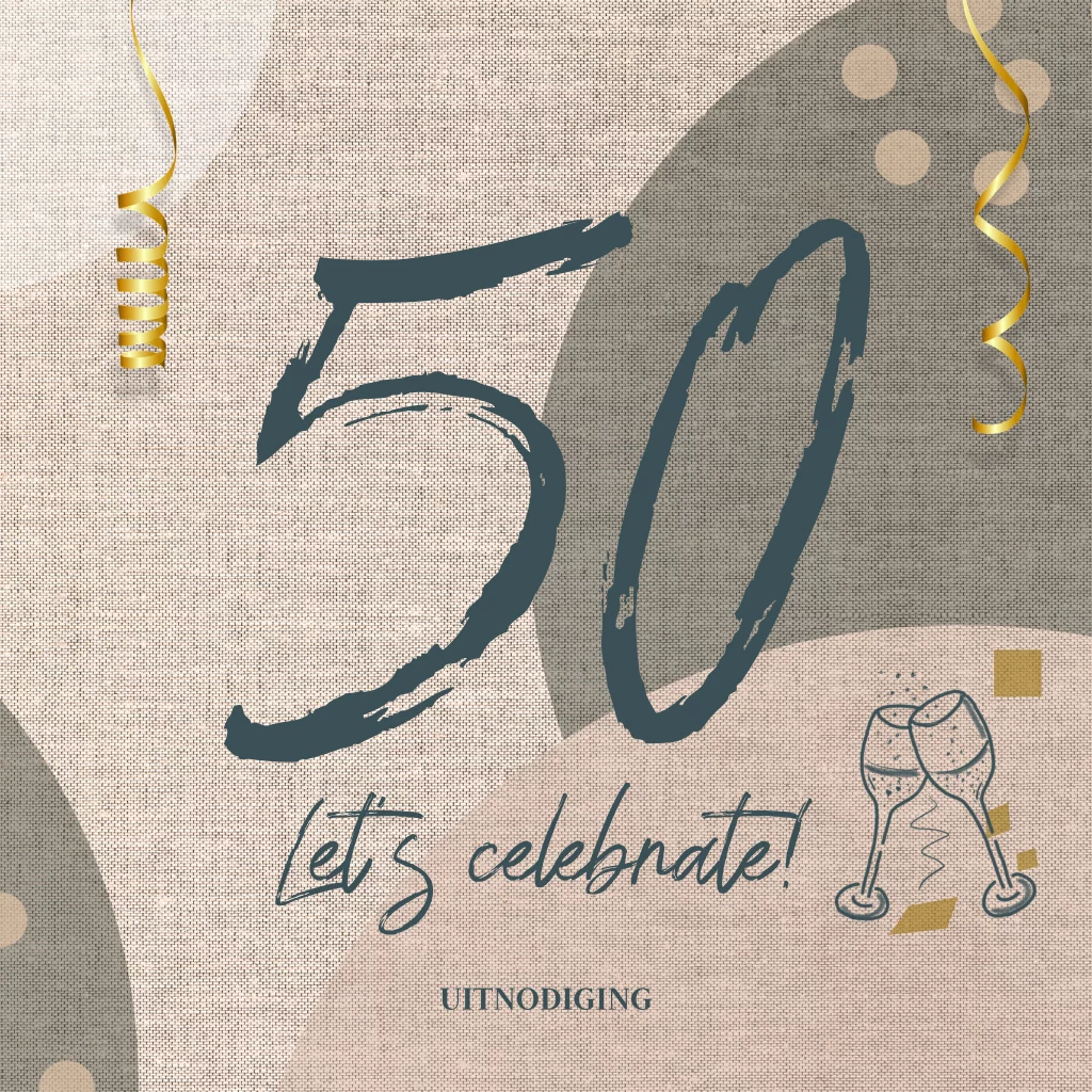 Een leuke uitnodiging voor een 50e verjaardag. Met linnen look op de achtergrond en hippe versieringen. (23315)