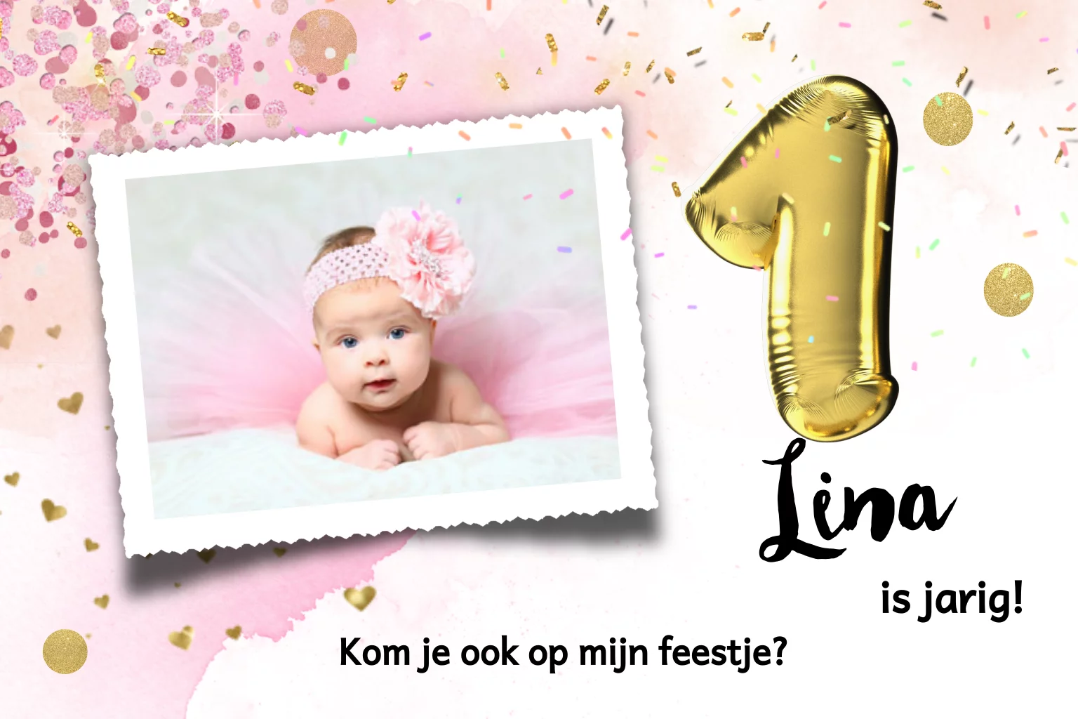 1ste verjaardag uitnodiging feestelijk met confetti, cijfer ballon en ruimte voor een eigen foto. (23590)