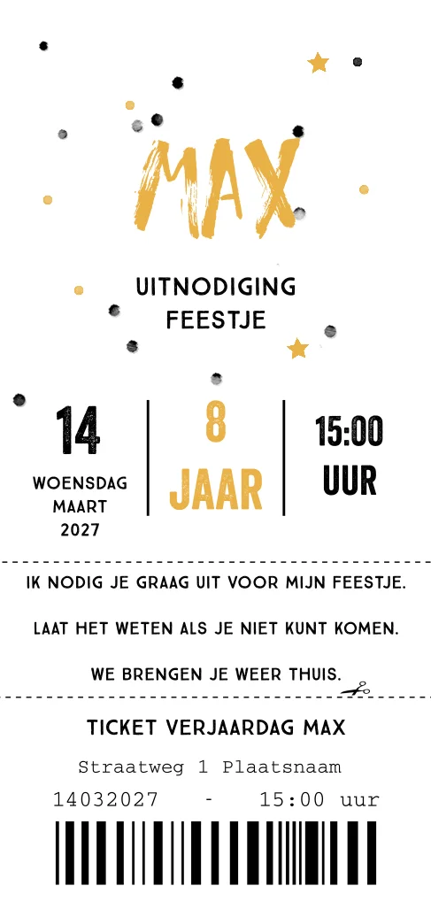 Uitnodiging verjaardag kind kinderfeestje in ticket stijl. zwart-wit en langwerpig formaat. (23916)