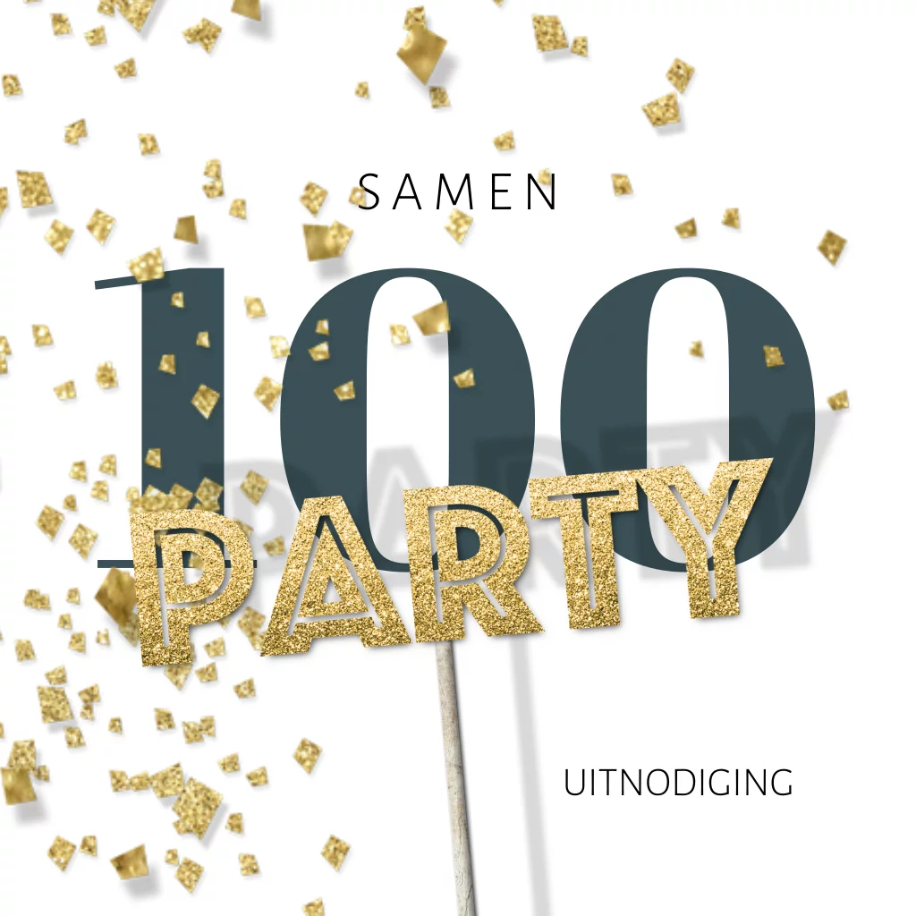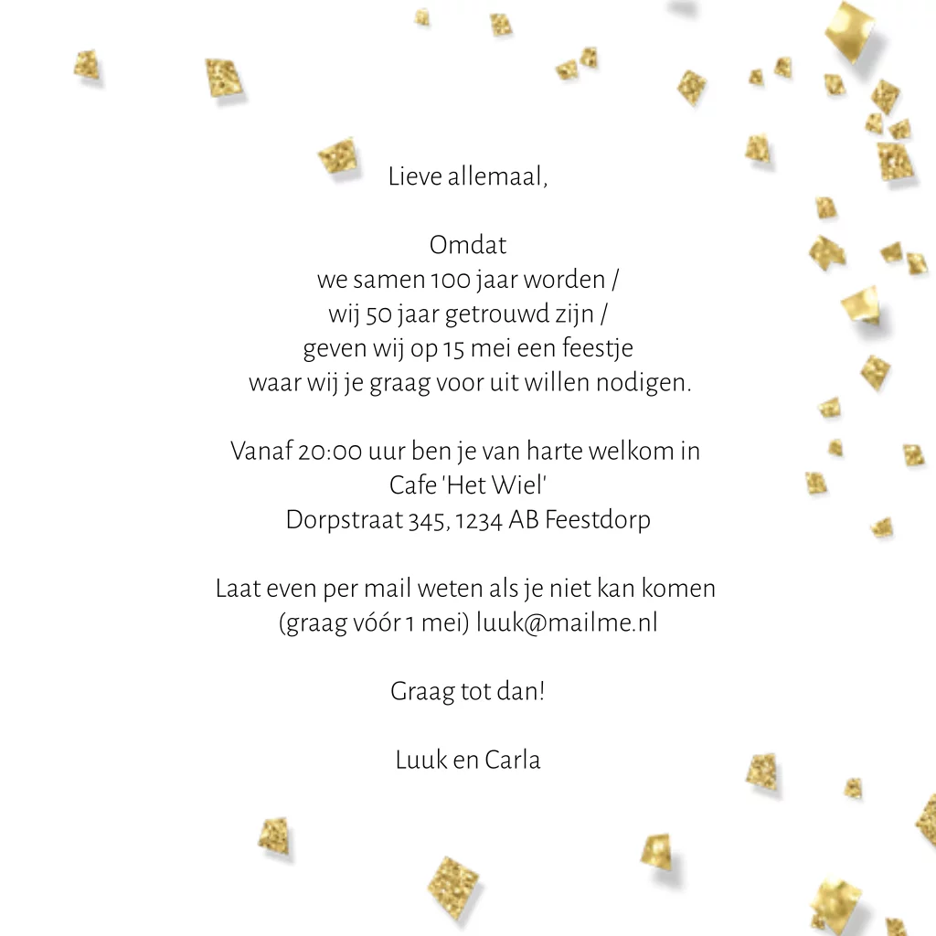 Uitnodiging voor 2 x een 50ste verjaardag of samen 100 jaar. De goud look spetters geven de kaart een extra feestelijke uitstraling. (24093)