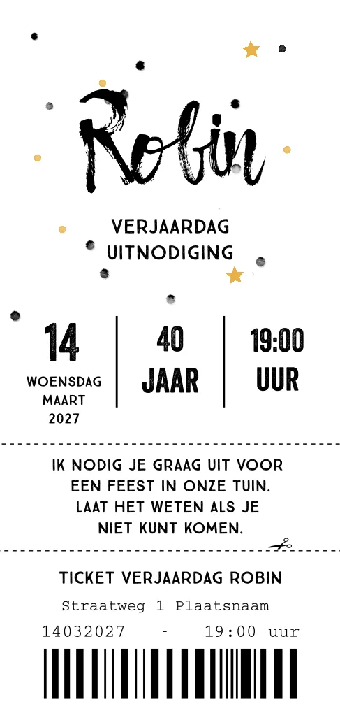 Uitnodiging 40 jaar verjaardag of andere feest in ticket stijl. zwart-wit en langwerpig formaat. Tekst en leeftijd zijn naar wens aan te passen. (23916)