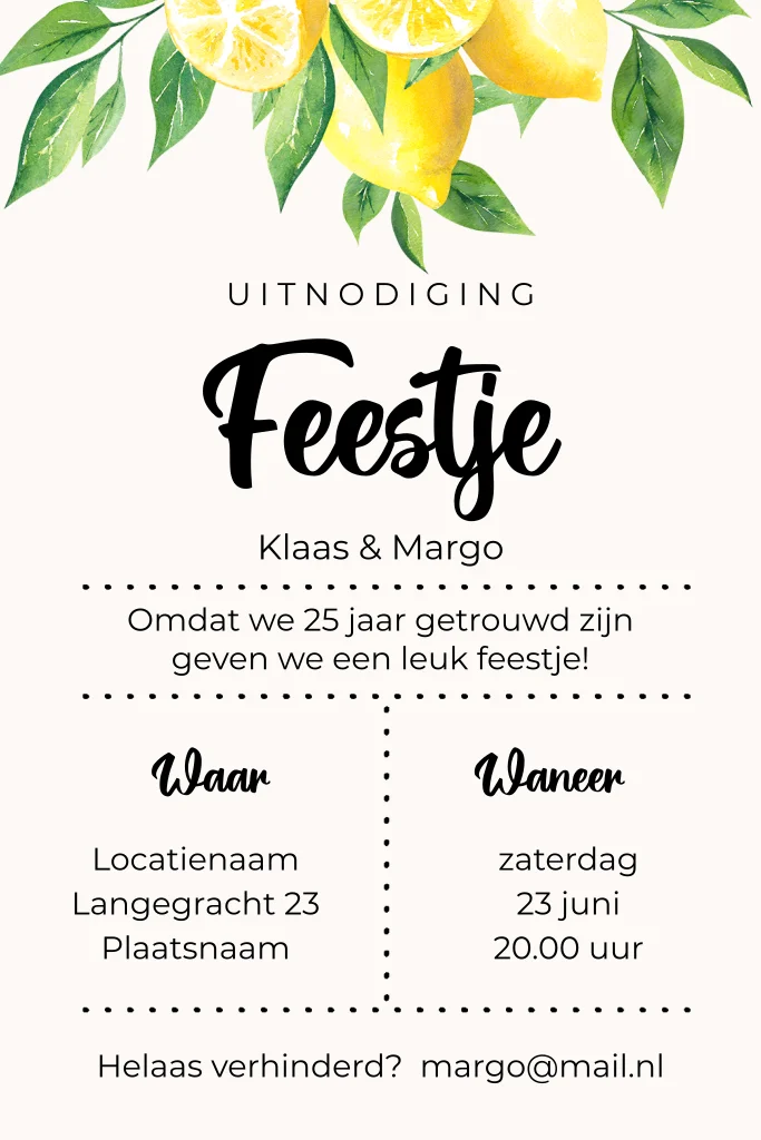Uitnodiging voor een feestje in zomerse sferen voor een verjaardag of jubileum met citroenen en bladeren op een beige achtergrond (23413). Deze kaart heeft ronde hoeken, maar kan ook met rechte hoeken ( - 0,30 per kaartje)