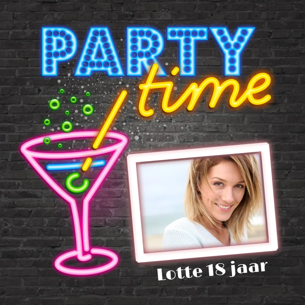Verjaardag uitnodiging neon party time en foto