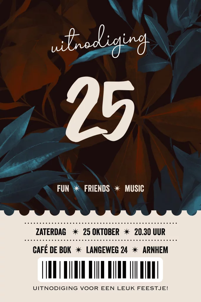 Moderne uitnodiging voor feestje of verjaardag 25 jaar in een ticket thema in botanische stijl met bladeren en rood en blauw (23474)