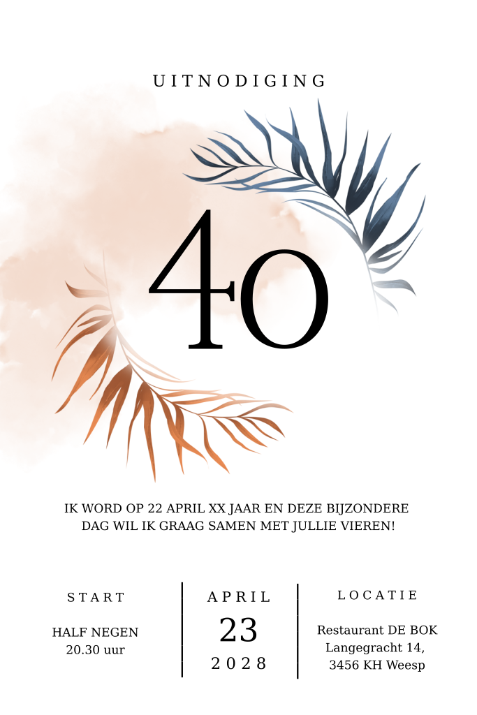 Verjaardag uitnodiging 40 jaar met roze waterverf en bladeren
