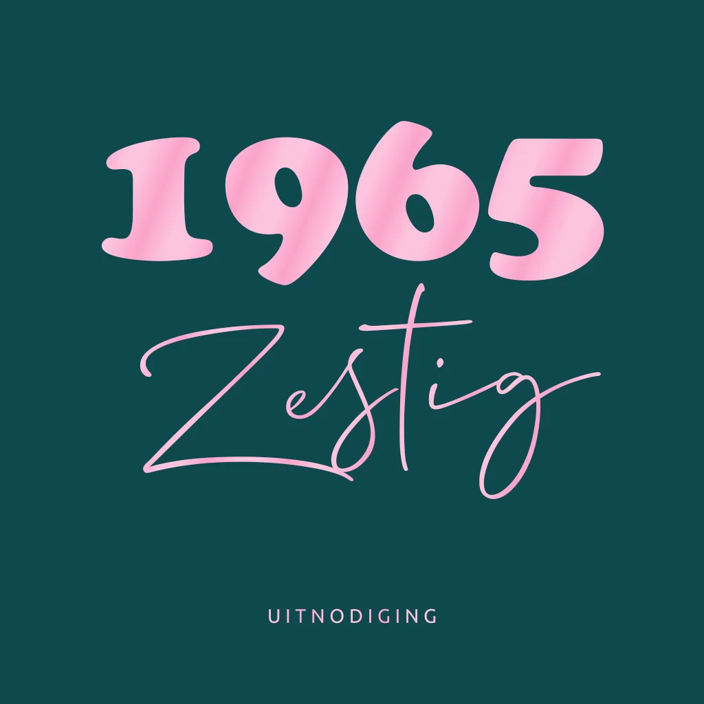 Vrolijk en moderne uitnodiging voor een 60este verjaardag feestje vrouw 60 Jaar in 1965 geboren. (23710) Met mooi flamingoroze hoogglans effect