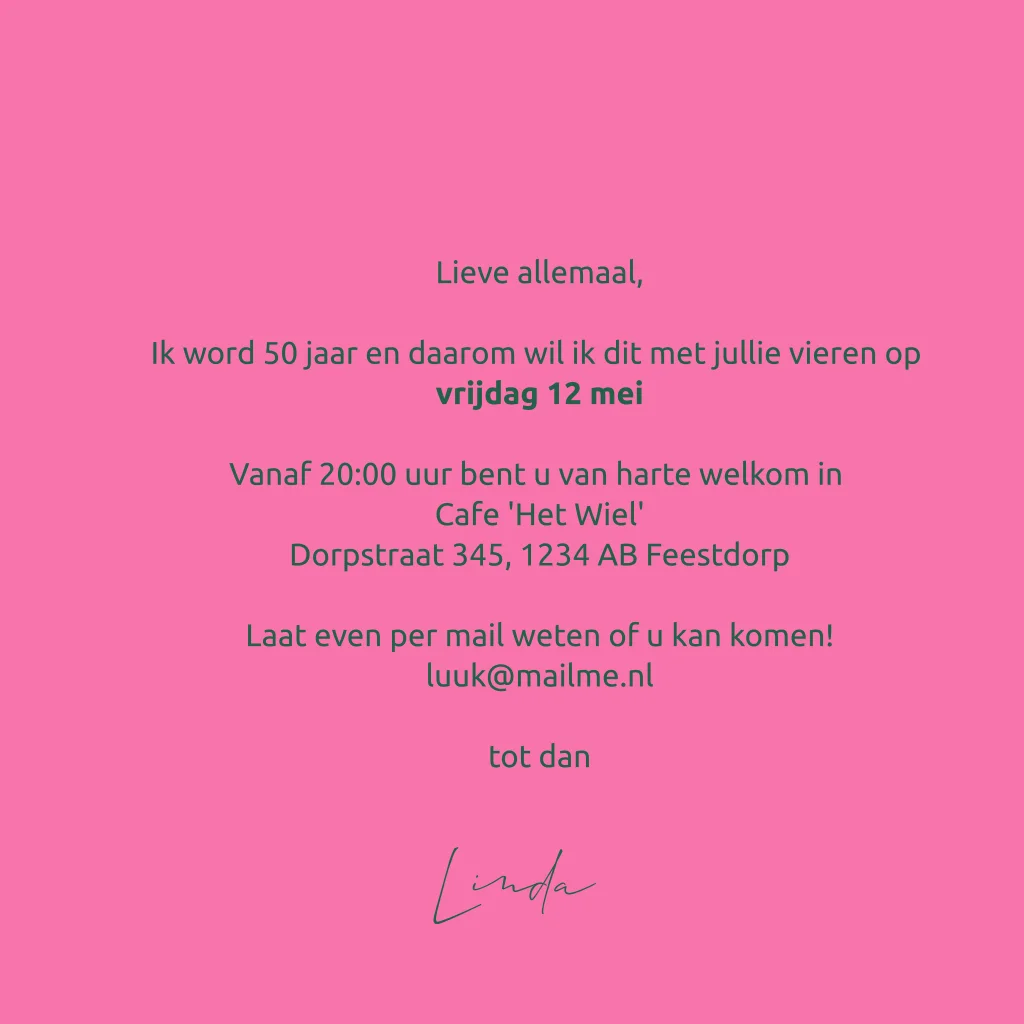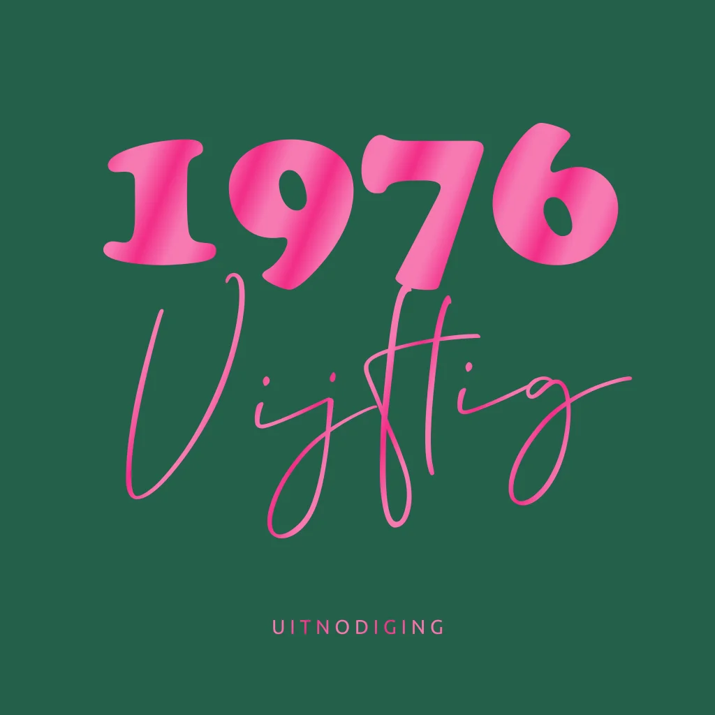 Vrolijk en moderne uitnodiging voor een 50ste verjaardag feestje vrouw 50 Jaar in 1976 geboren. (23710) Met mooi roze hoogglans effect
