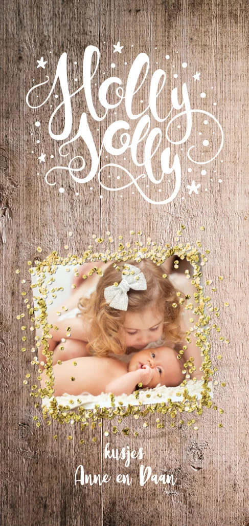 Winterse kerstkaart met hout design op de ondergrond, goud korrel kader en prachtige handlettering Holly Jolly. Extra lang formaat (21x10cm)! Zelf maken. (24117)