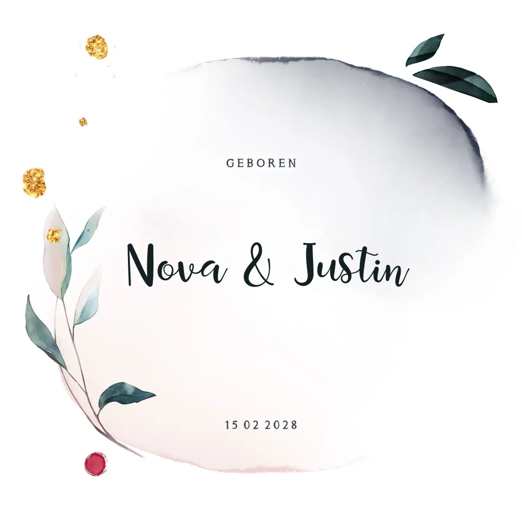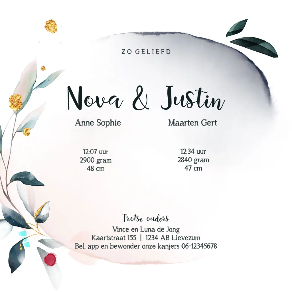 Modern geboortekaartje voor een tweeling. Met aquarel in roze en blauw. (23630)