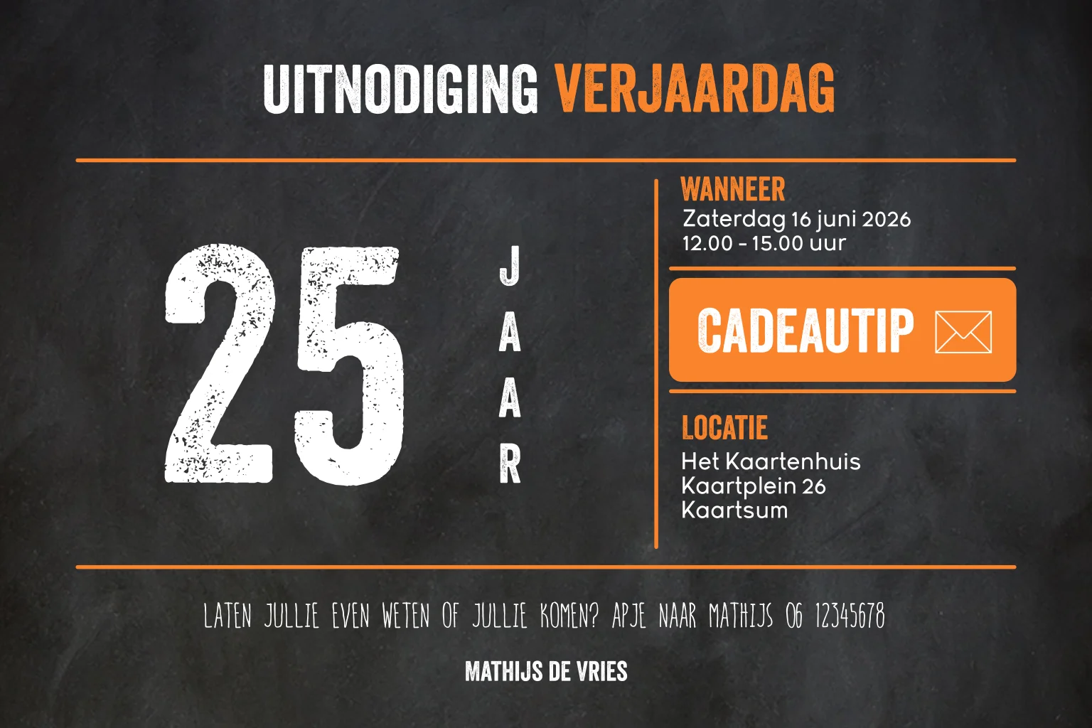 Een stoere uitnodiging voor een 25e verjaardagsfeest met krijtbord achtergrond. (22568)