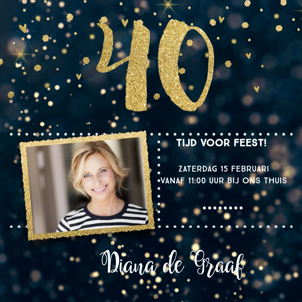 Uitnodiging 40e verjaardag met goudkleurige details en confetti. (6442) Wil je een ander jaartal in dezelfde stijl op de kaart? Kijk bij afbeeldingen > cijfers of neem contact met ons mee. We zetten dit gratis voor je om.