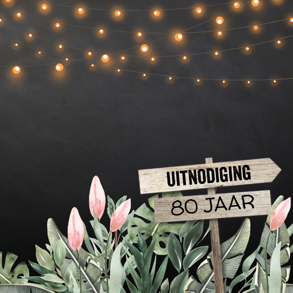 80ste verjaardag uitnodiging met bloemen, lampjes en houten wegwijzer